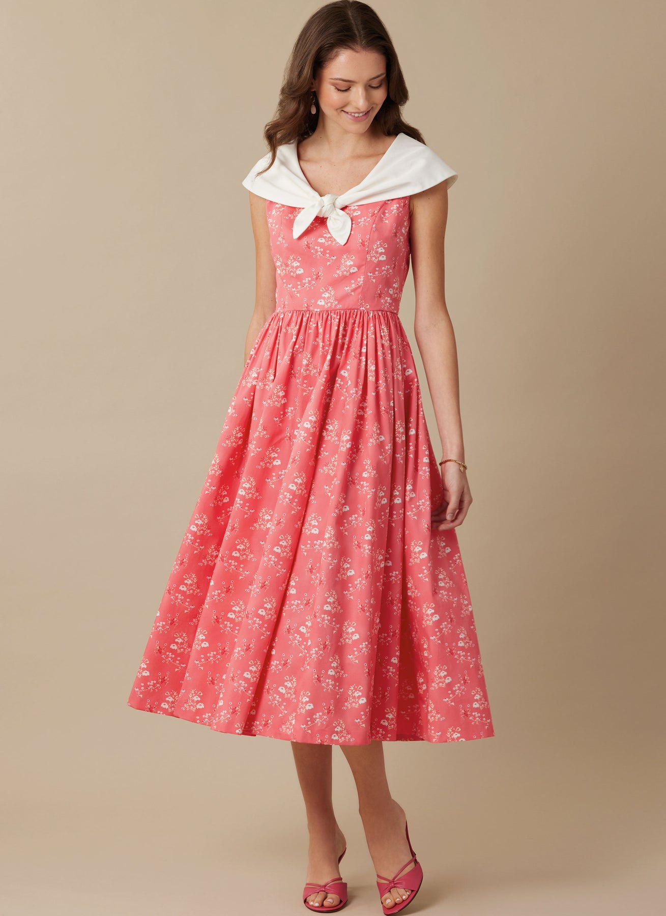 Vintage McCall's 1980's Laura Ashley Kleid Nähmuster. Kleid A oder B mit oder ohne kurze Ärmel hat einen Kragen mit Bändern, ein gefüttertes Oberteil mit Prinzessnähten vorne und hinten, einen seitlichen Reißverschluss, einen gerafften Rock und eine Seitennahttasche. Die authentische Vintage-Reproduktion enthält zusätzliche Größen und Schnittmuster.