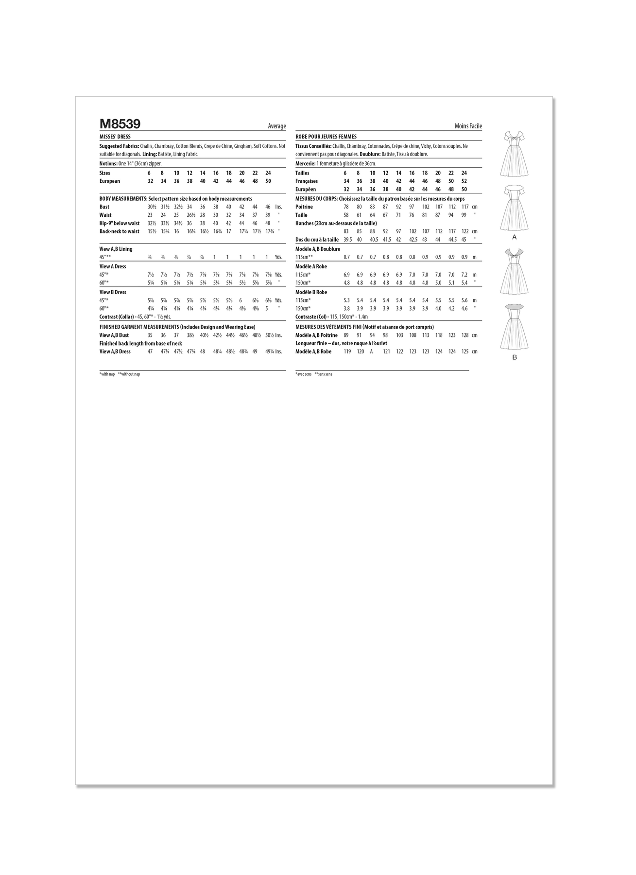 Challis, Chambray, Baumwollmischungen, Crepe de Chine, Gingham, weiche Baumwollstoffe. Nicht für Diagonalen geeignet. Innenfutter: Batist, Futterstoff.
