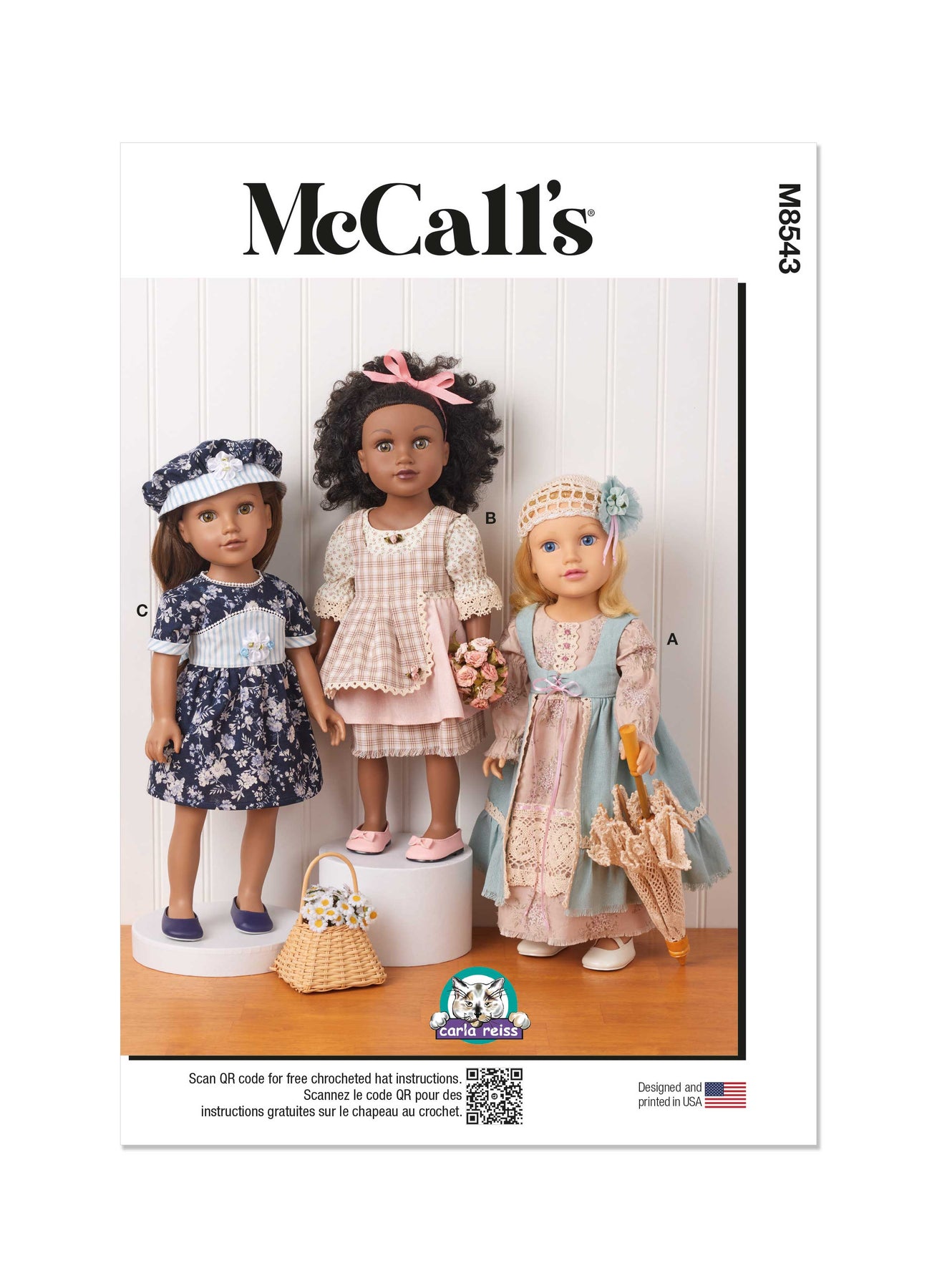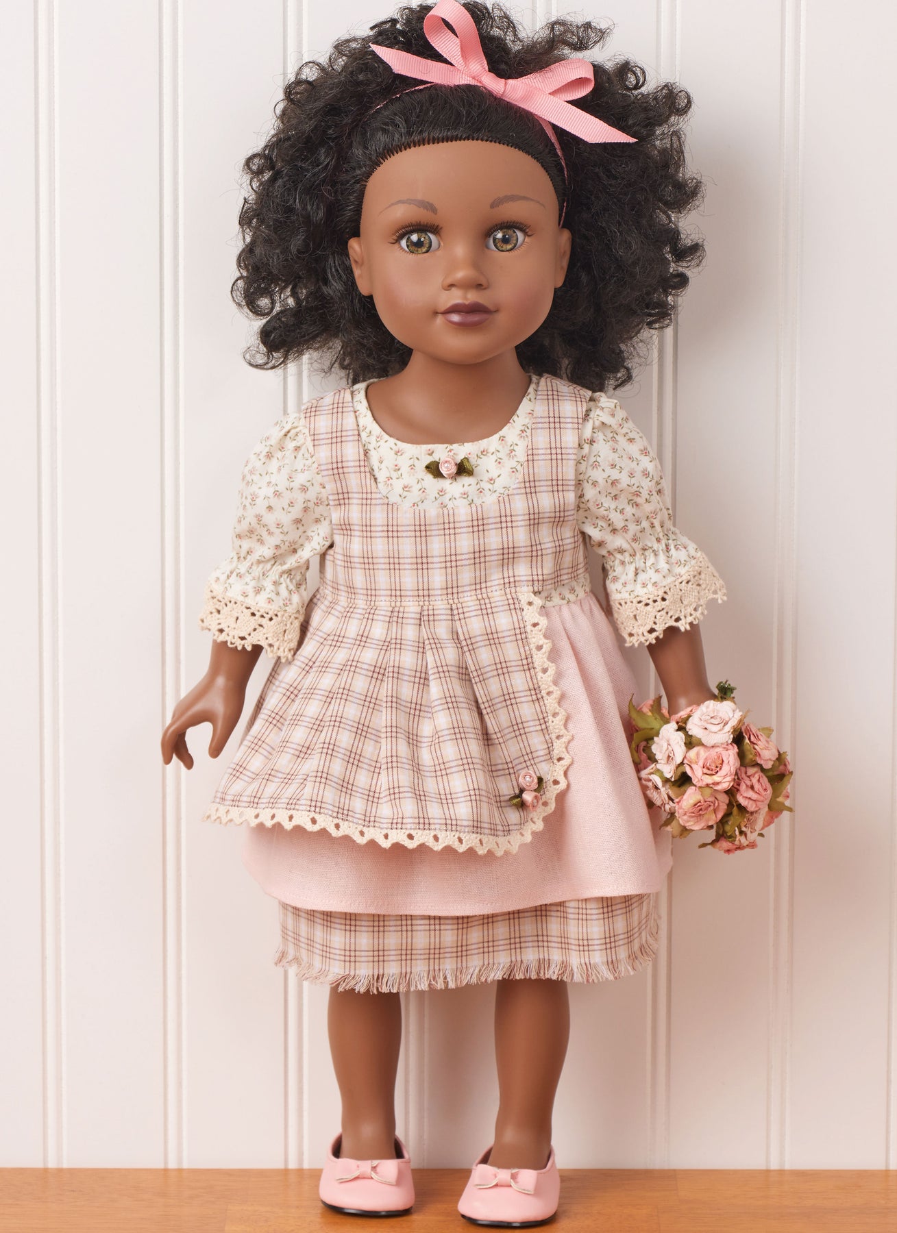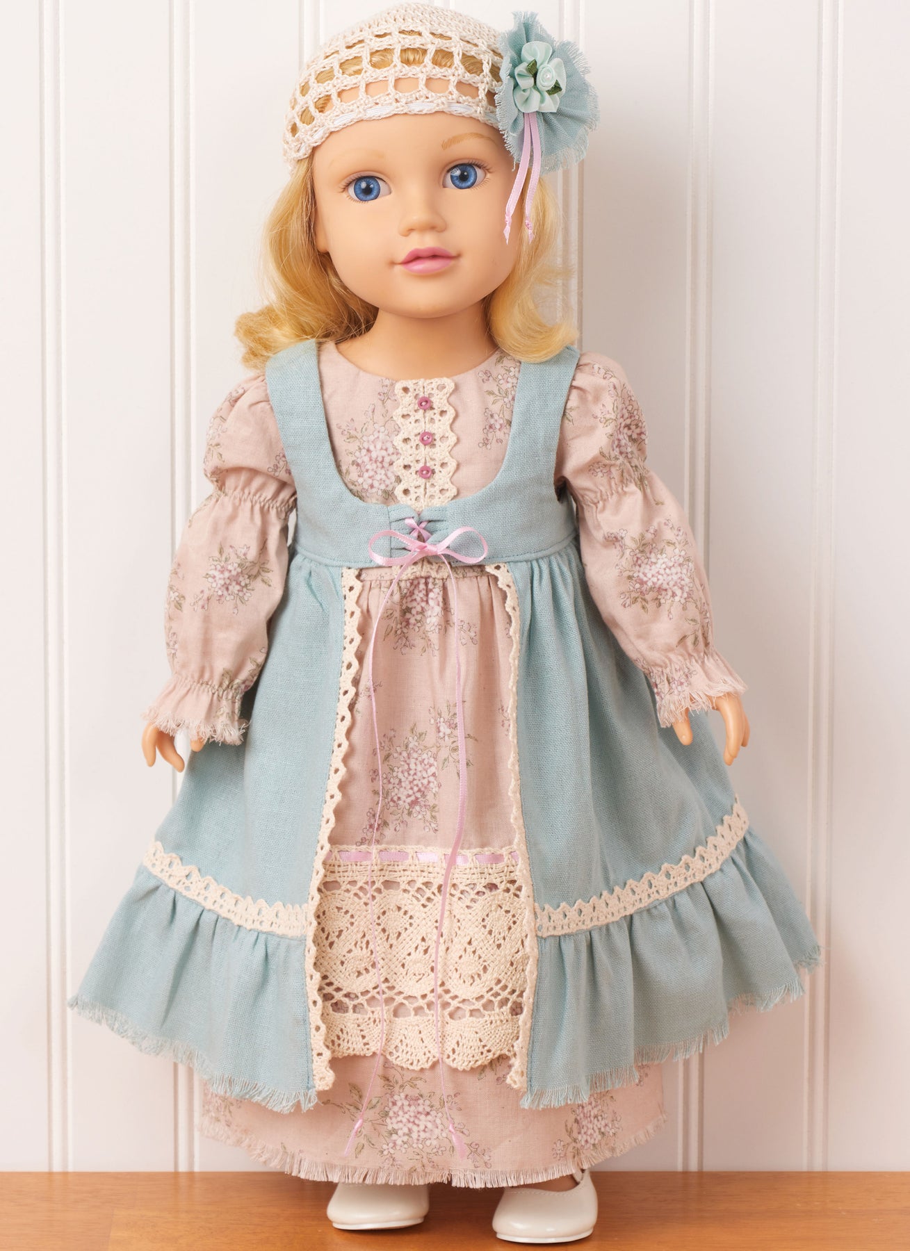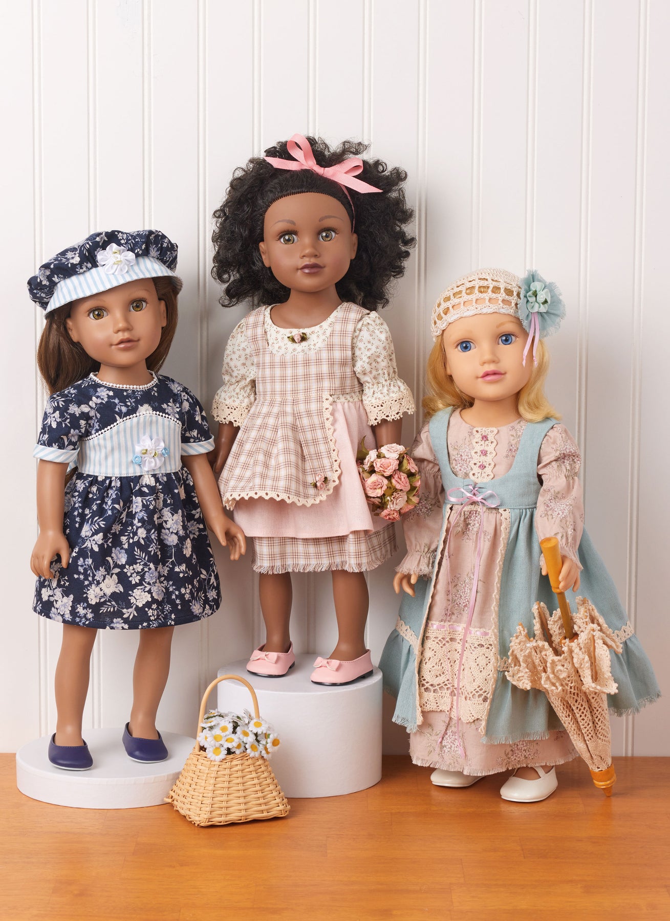 Cottage Core Kleider für 18 Puppen haben erhöhte Taillennähte, Klettverschluss auf der Rückseite, geraffte Röcke und leicht gepuffte Ärmel. Langes Kleid mit Spitzenbesatz und doppelt gepufften, elastischen langen Ärmeln wird mit einer vorne offenen Schürze mit vorderer Schnürung getragen. Kurzes Kleid mit passender asymmetrischer Schürze mit kontrastierendem Mieder und kurzen Ärmeln sowie kontrastierendem Überrock. Kurzes Kleid mit kontrastierendem Mittelteil, Bindebändern und Ärmelbändern, mit passendem Hut und Bandrosetten. Siehe Umschlag für weitere Informationen.