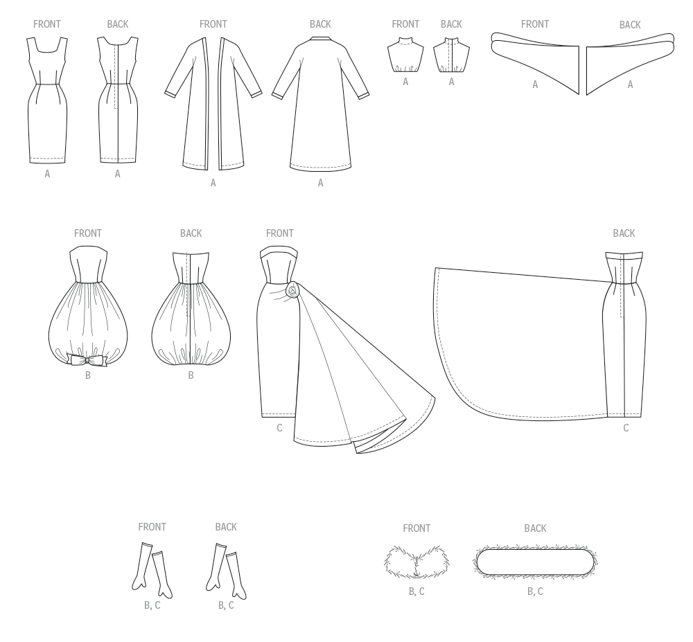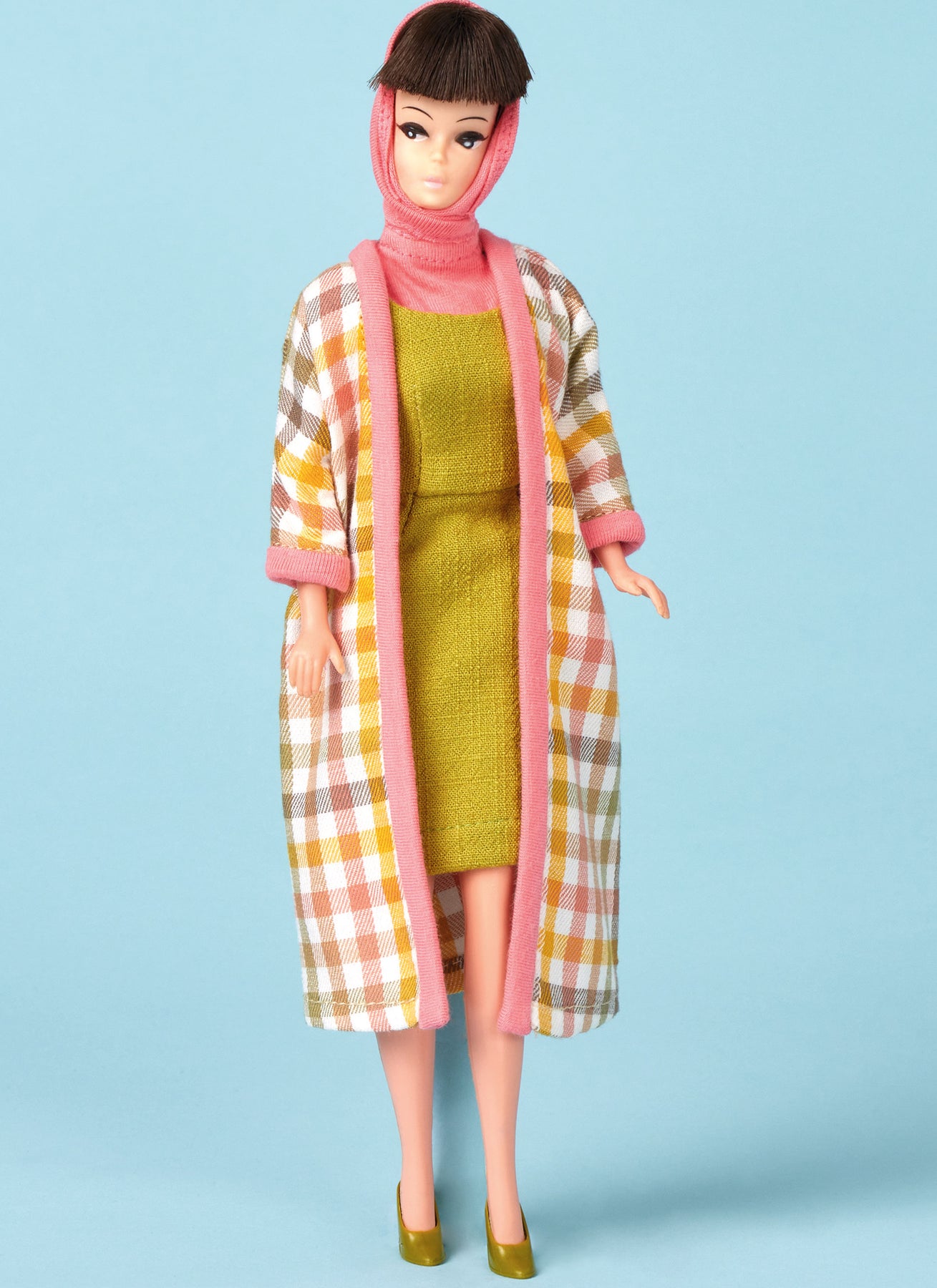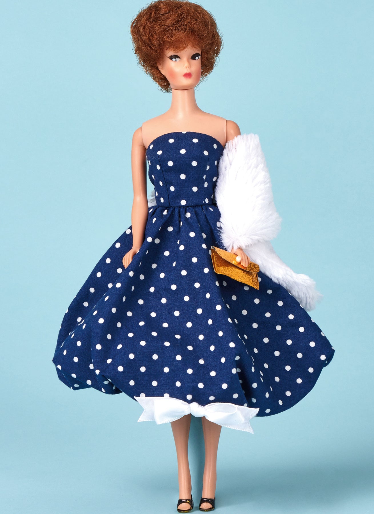 Zu den Teilen im Vintage-Look für 11-1/2"-Modepuppen gehören Kleider und eine Mütze mit Druckknopfverschluss, eine Stola mit Haken- und Ösenverschluss, ein Schal und Handschuhe. Der Mantel hat eine koordinierende Bindung. Eine Bandschleife befindet sich am unteren Ende des Bubikopf-Rocks von Kleid B und eine gekaufte Rosette an der Taille von Kleid C.