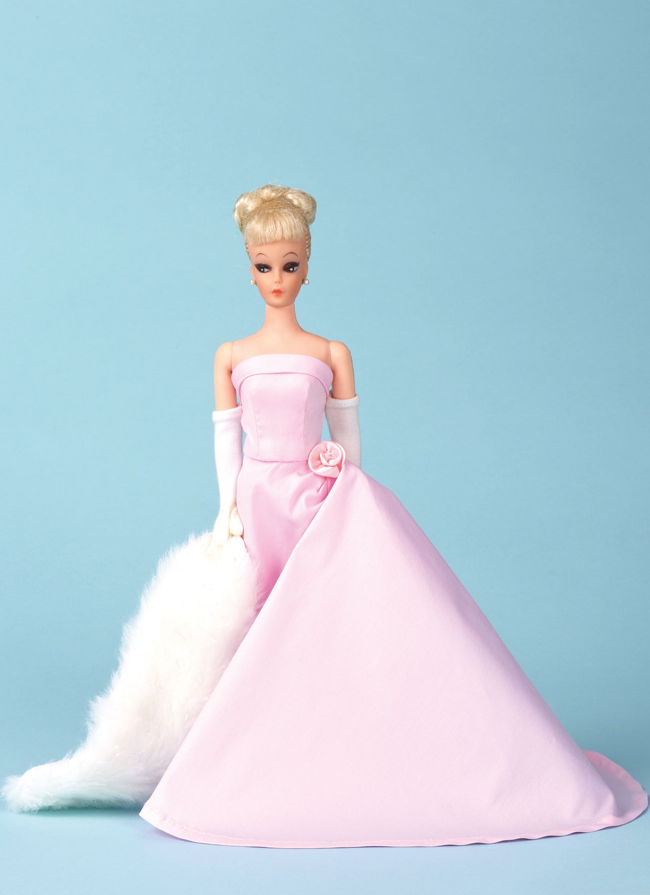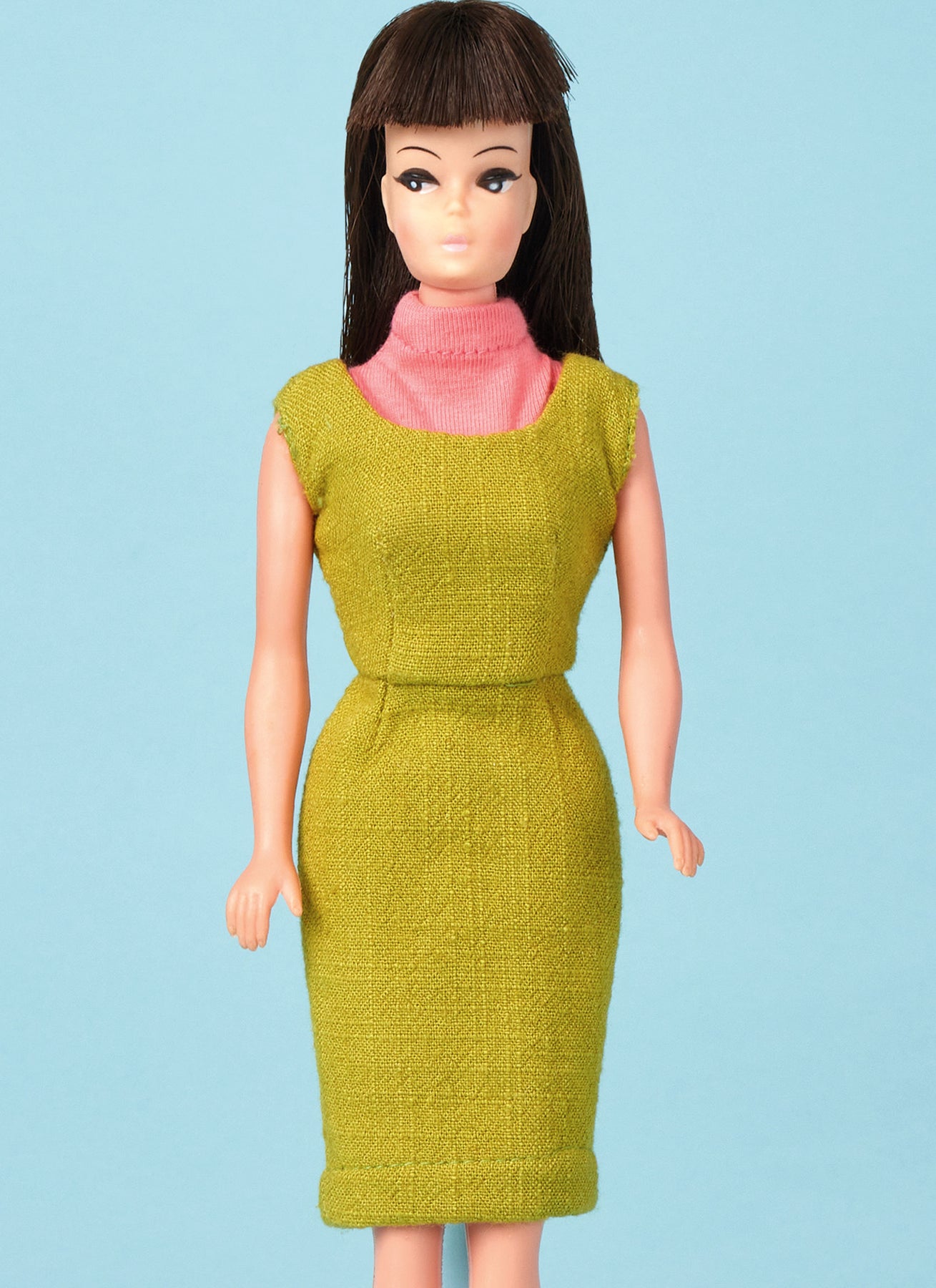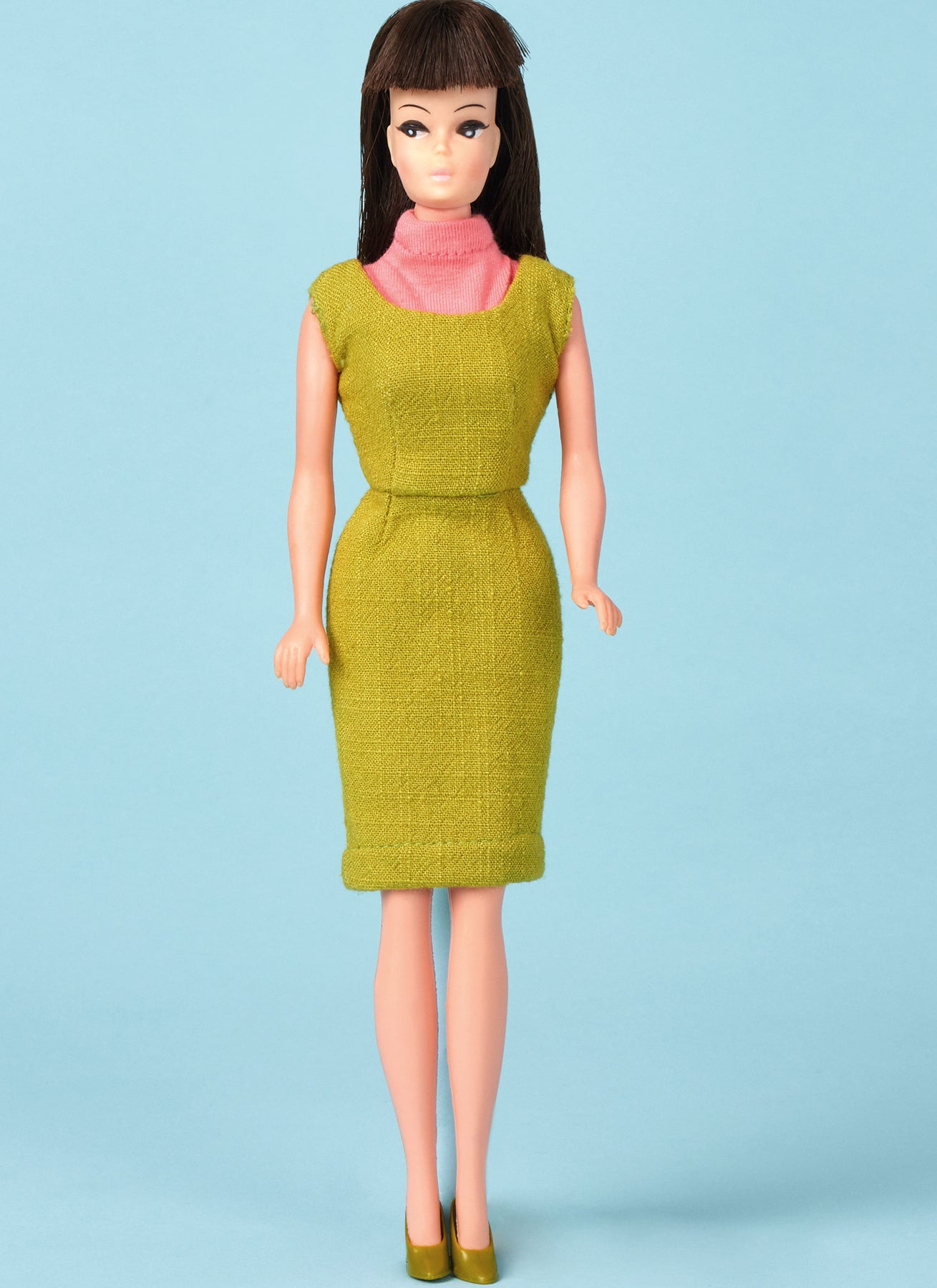 Zu den Teilen im Vintage-Look für 11-1/2"-Modepuppen gehören Kleider und eine Mütze mit Druckknopfverschluss, eine Stola mit Haken- und Ösenverschluss, ein Schal und Handschuhe. Der Mantel hat eine koordinierende Bindung. Eine Bandschleife befindet sich am unteren Ende des Bubikopf-Rocks von Kleid B und eine gekaufte Rosette an der Taille von Kleid C.