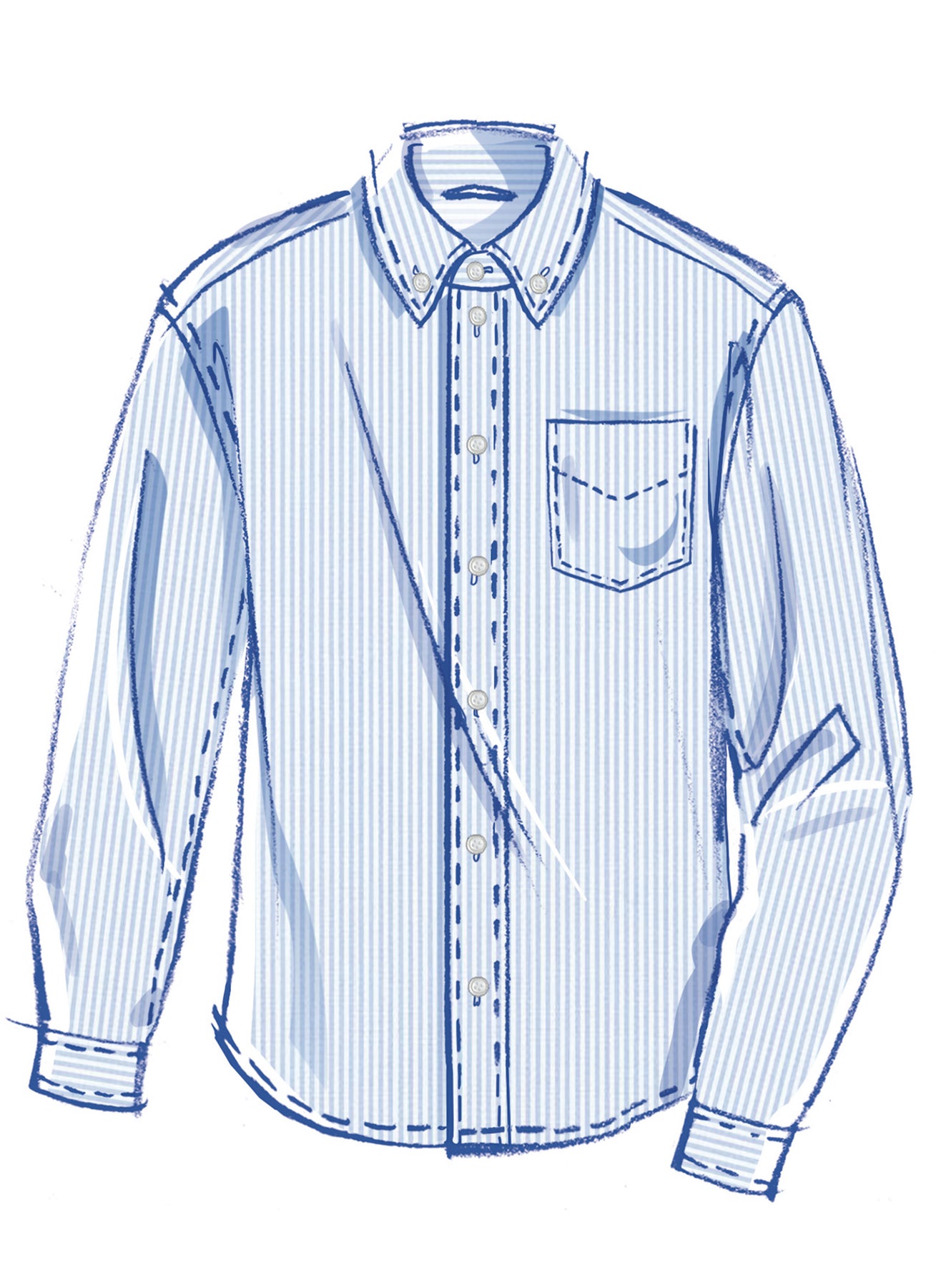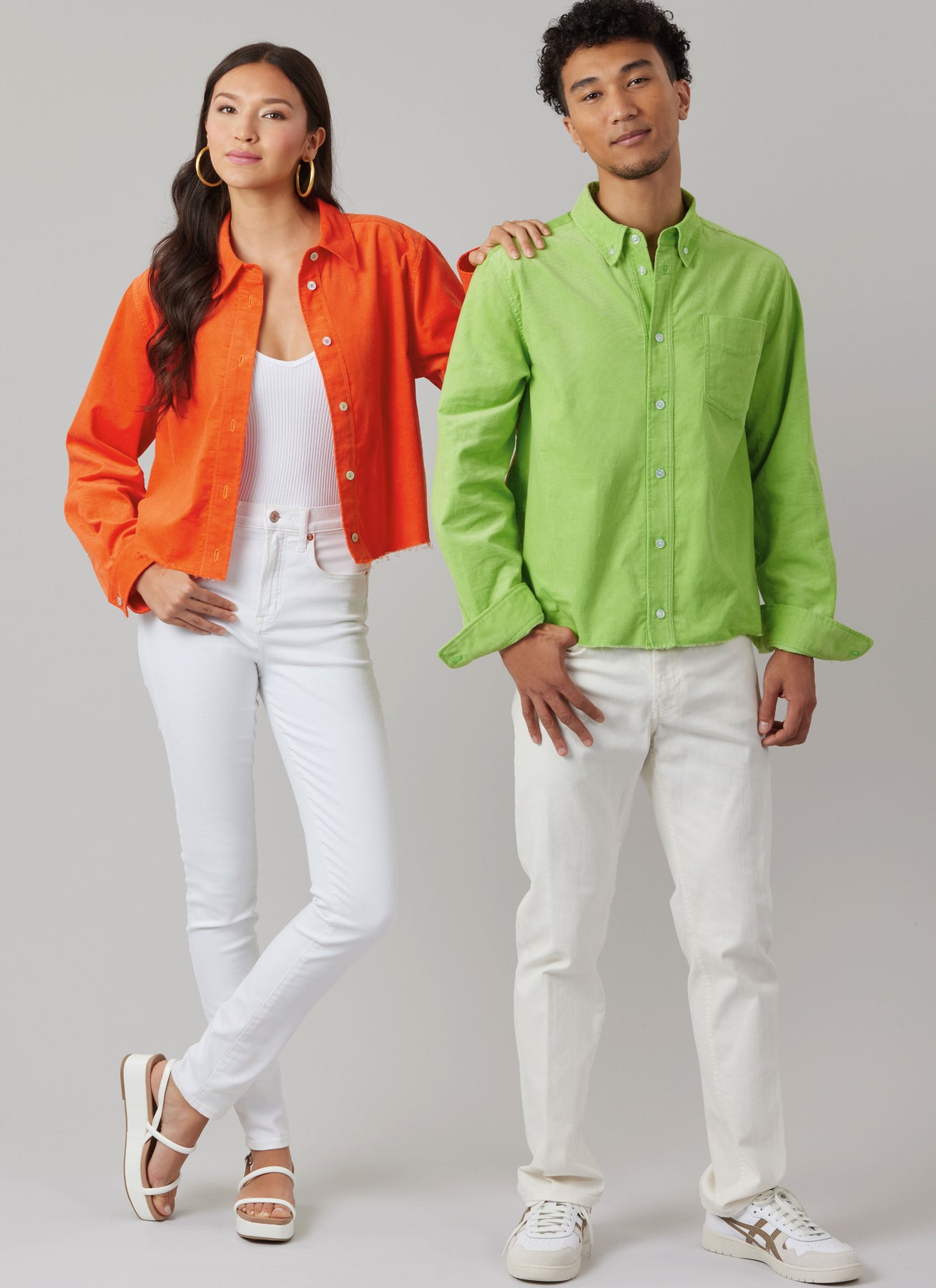 Locker sitzende, taillierte Unisex-Hemden haben eine Knopfleiste, lange Ärmel mit geknöpften Manschetten und Knopfleiste, eine Rückenpasse und Falten. Die Ansichten A und B haben einen rohen Saum. Ansicht C hat einen geformten, abgesteppten Saum. Die Ansichten B und C haben einen geknöpften Kragen und eine aufgesetzte Vordertasche.