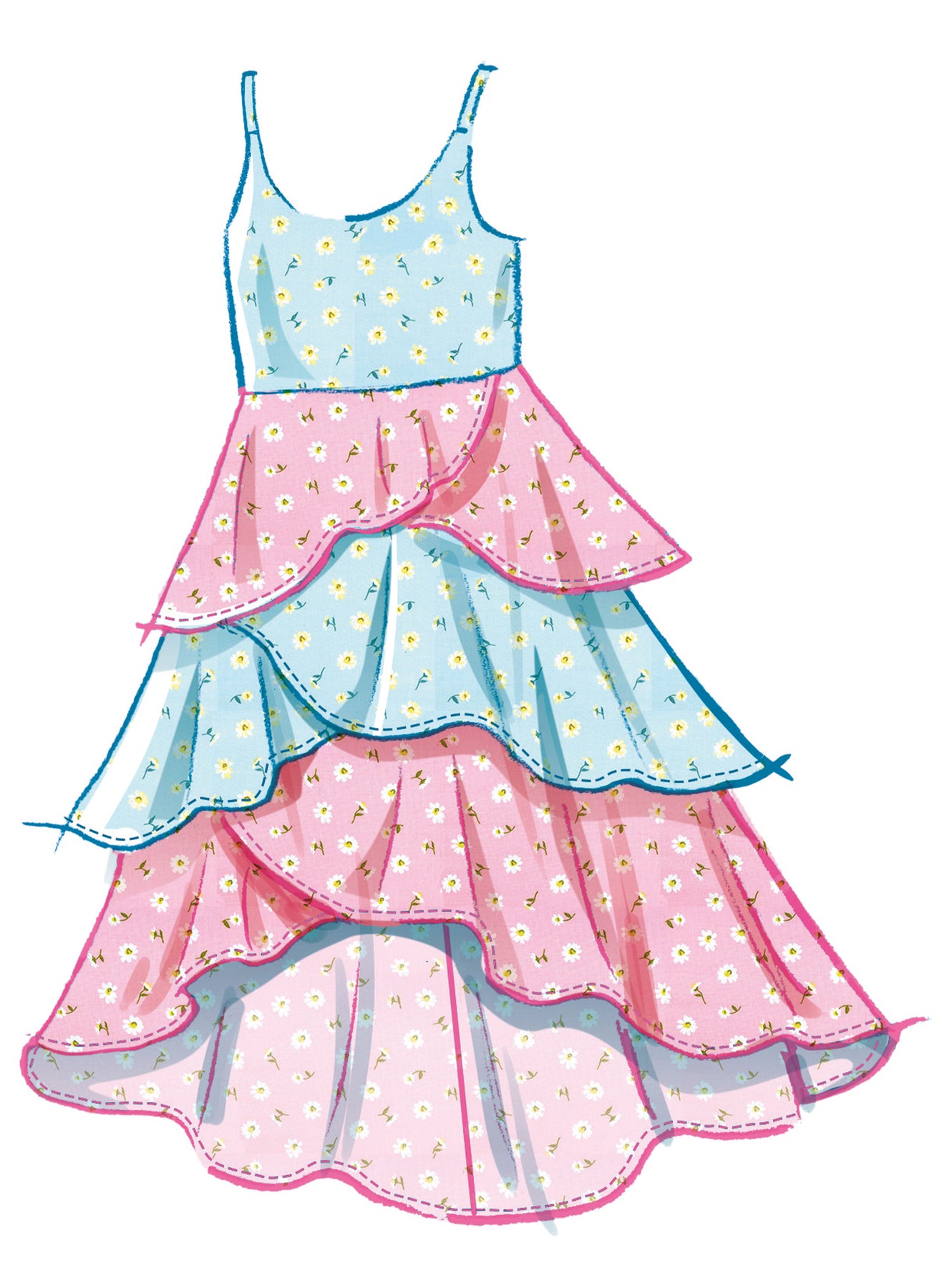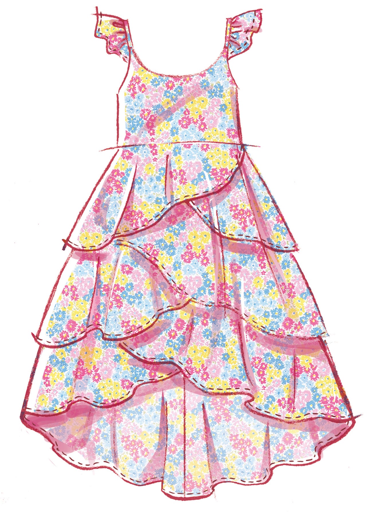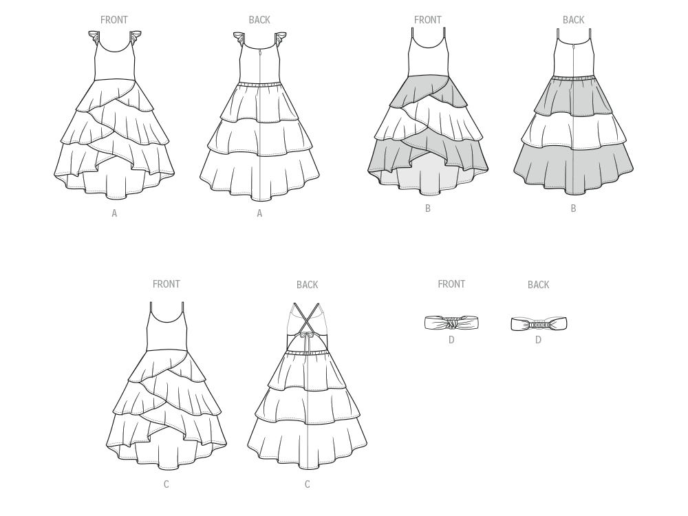 Kleider mit Trägern oder Schulterrüschen haben einen Rundhalsausschnitt, einen Rock mit Volants und einen hochgeschlossenen Saum. Das Kleid in Ansicht B hat einen Kontrast am Rock. Das Stirnband gibt es in vier Größen: XS (18), S (19), M (20"), L (21).