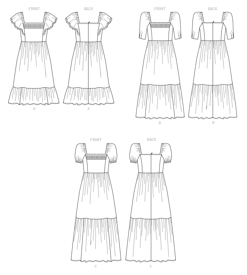 Das Kleid mit hoher Taille hat einen quadratischen Ausschnitt mit Biesen und Ärmelvariationen, und der geraffte, volle Rock hat einen Volantsaum.