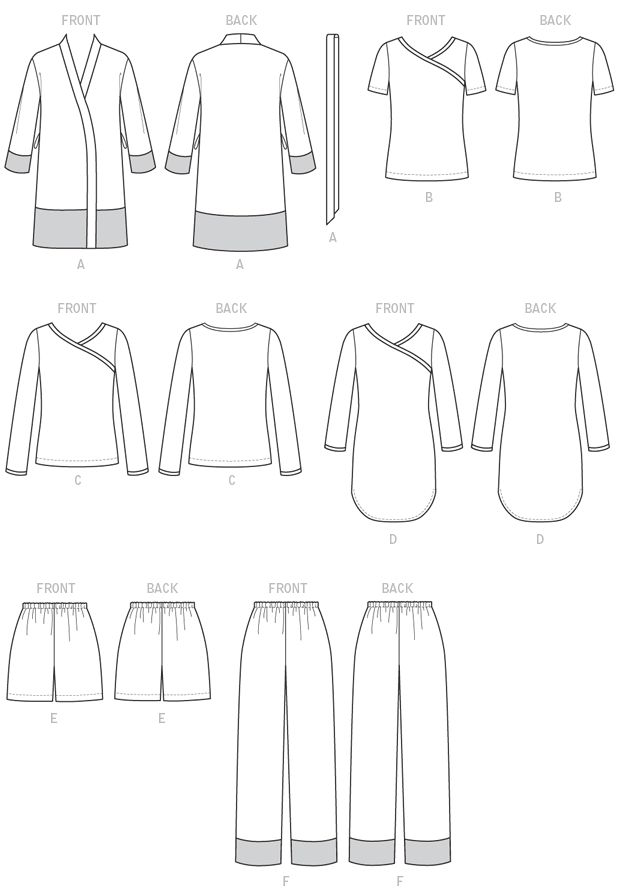 Der sehr locker sitzende Wickelmantel hat Bänder, Fadenschlaufen und einen eigenen Gürtel. Halb taillierte Oberteile und Kleid (im Brustbereich eng anliegend) mit Passe, schmalem Saum und gekauftem Besatz. B: Abgenähter Saum an den Ärmeln. Locker sitzende Shorts und Hosen haben einen Gummizug in der Taille. E: Abgenähte Säume. F: Beinabschlüsse. B, C, D: Nur für mäßig dehnbare Strickwaren.
