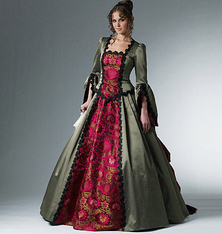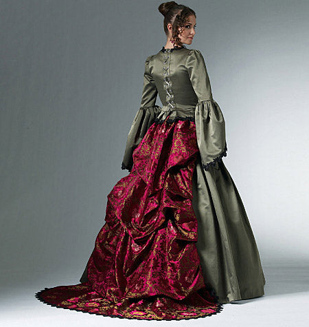 Mit dem McCall’s Schnittmuster M6097 nähst du ein prachtvolles viktorianisches Damenkostüm aus den 1890er Jahren, das Eleganz und Raffinesse vereint. Das gefütterte Oberteil beeindruckt mit einem tiefen, quadratischen Ausschnitt, geformten Ärmeln mit Volants und einem zarten Schößchen, das die Taille elegant betont. Eine dekorative Rückenschnürung sorgt für die perfekte Passform. Der Rock ist kunstvoll gerafft, verfügt über eine abnehmbare Schleppe und eine charmante Rückenspitzenverzierung. Dieses Design ist ideal für Rollenspiel, Theater, historische Mode oder Kostümfeste – ein echtes Meisterwerk viktorianischer Schneiderkunst.