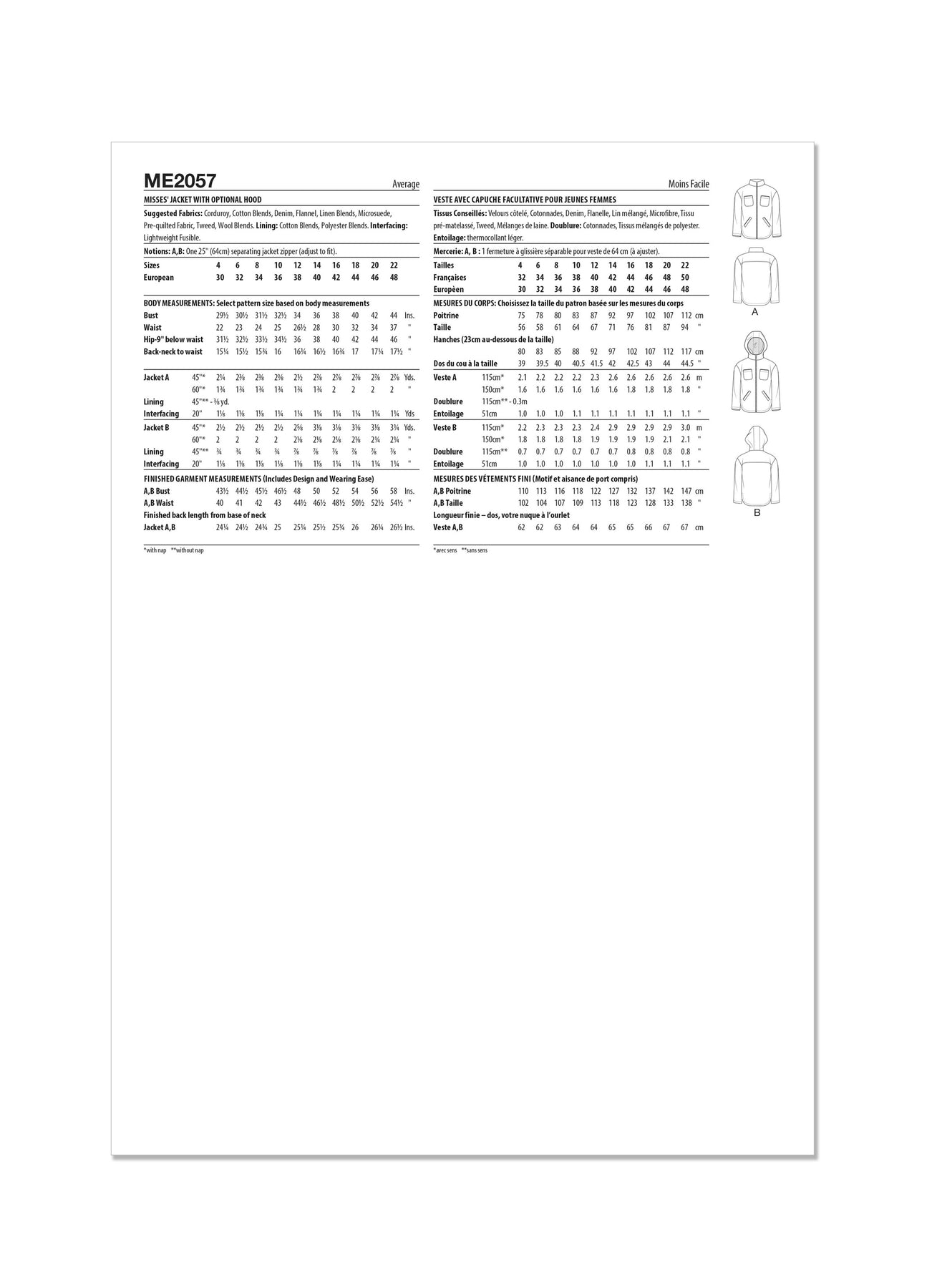 Stoffempfehlung:A: Baumwollstoffe, Leinenmischgewebe, Popeline, reißfestes Nylon. Kontrast A,B : Maschenstoffe. B: Chino, Baumwollstoffe, leichter Twill, Leinenmischgewebe, reißfestes Nylon. Einlage: Leichte Thermokleber