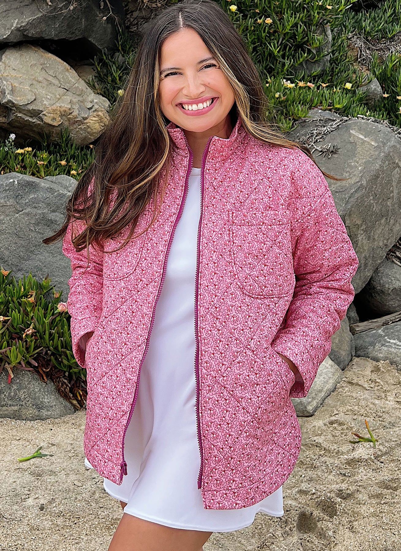 Die Jacke mit Reißverschluss hat einen hohen Kragen und eine optionale Kapuze, überschnittene Schultern, einen abgerundeten Schlitz am Saum, aufgesetzte Taschen und Leistentaschen.