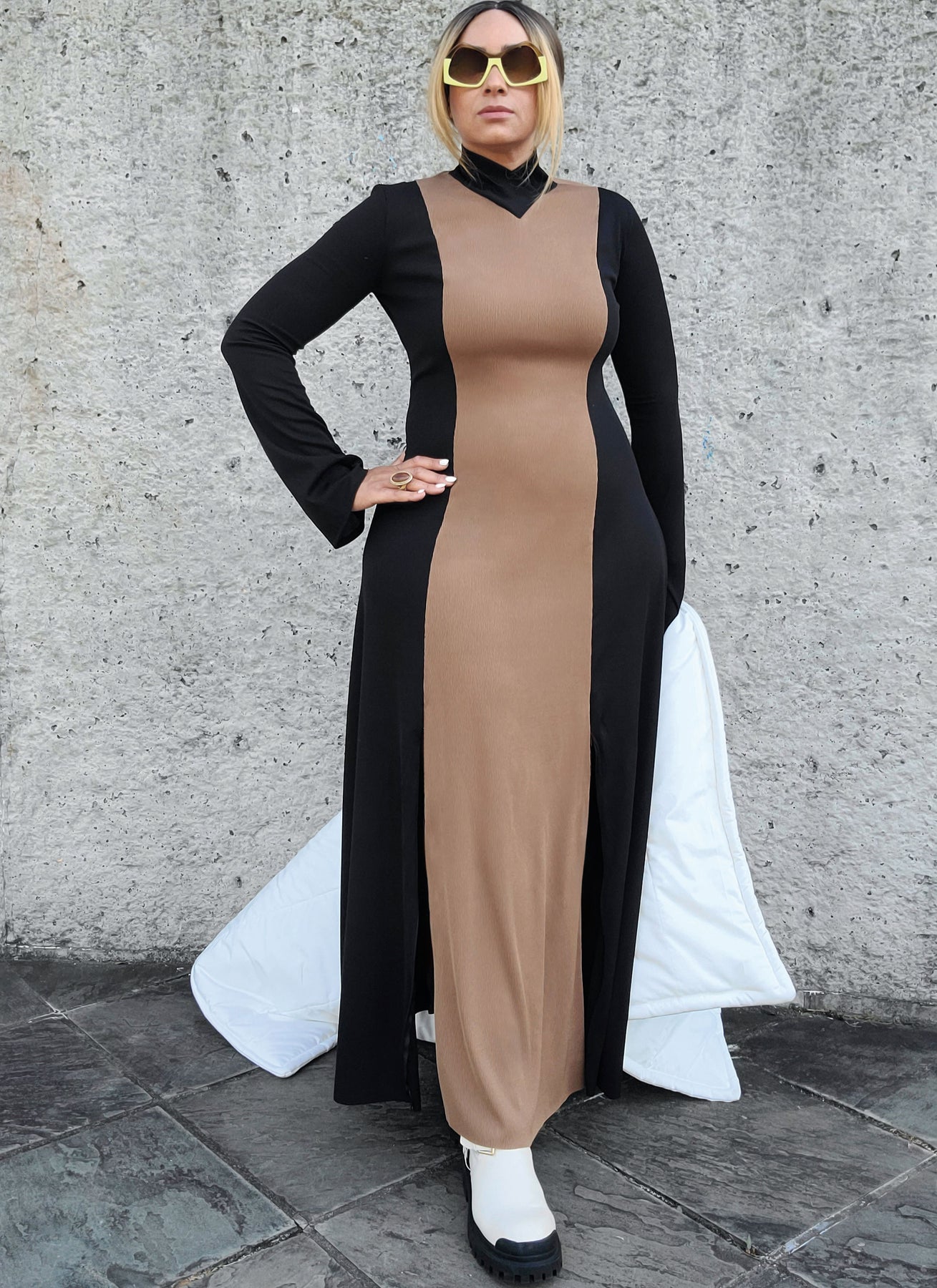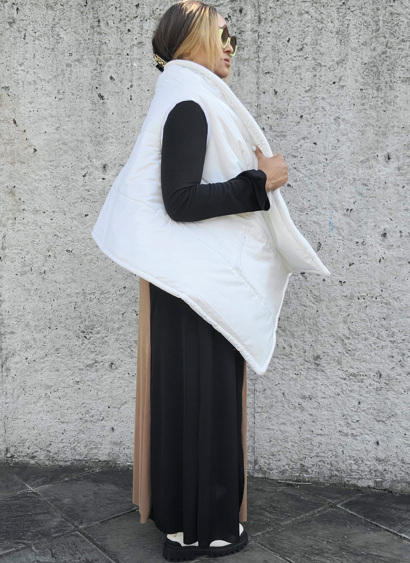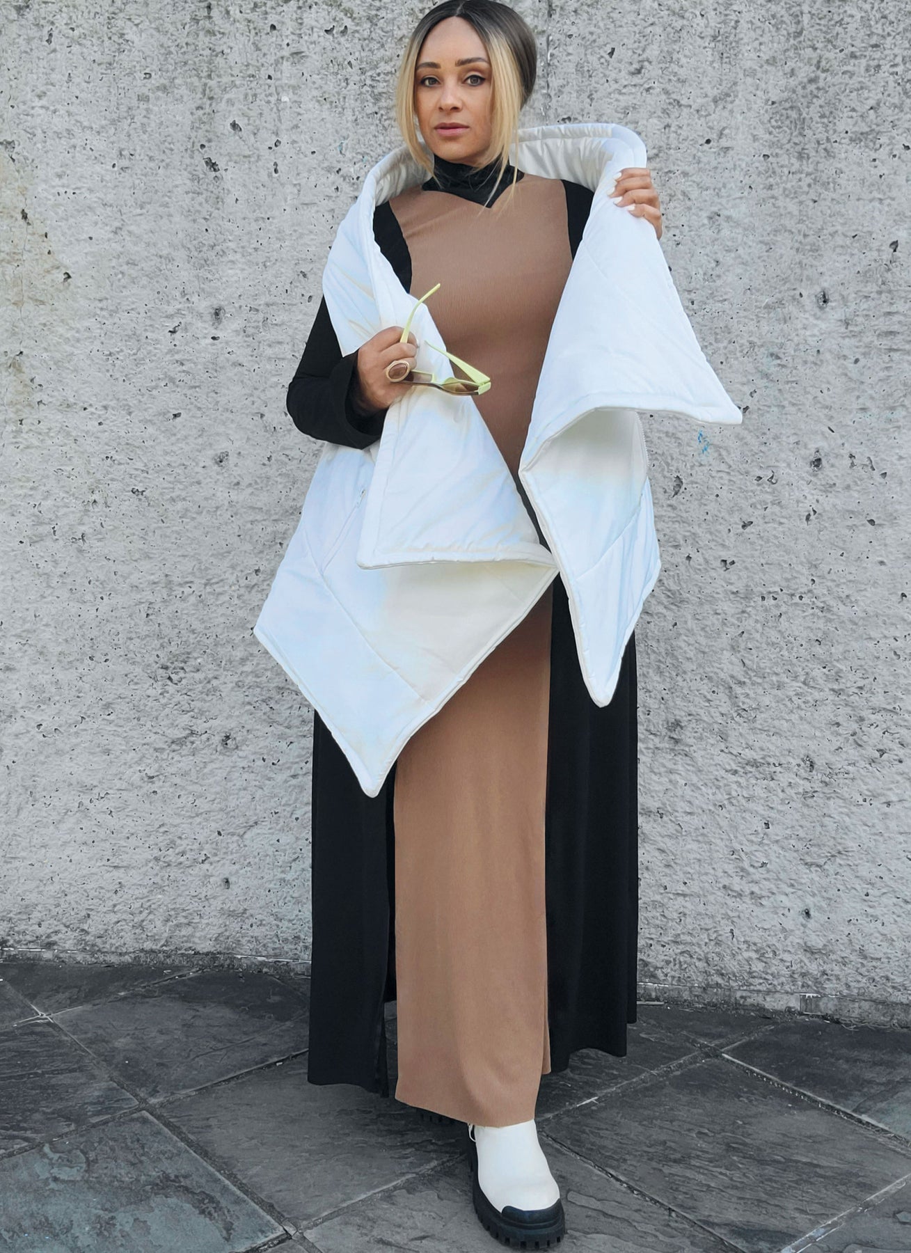 Das Strickkleid mit überkreuztem Wickelausschnitt hat Glockenärmel und unsichtbare Reißverschlüsse von der Saumlinie bis knapp über das Knie an jeder Prinzessnaht. Der Pufferschal hat ein Futter und unsichtbare Reißverschlüsse an den Taschen.