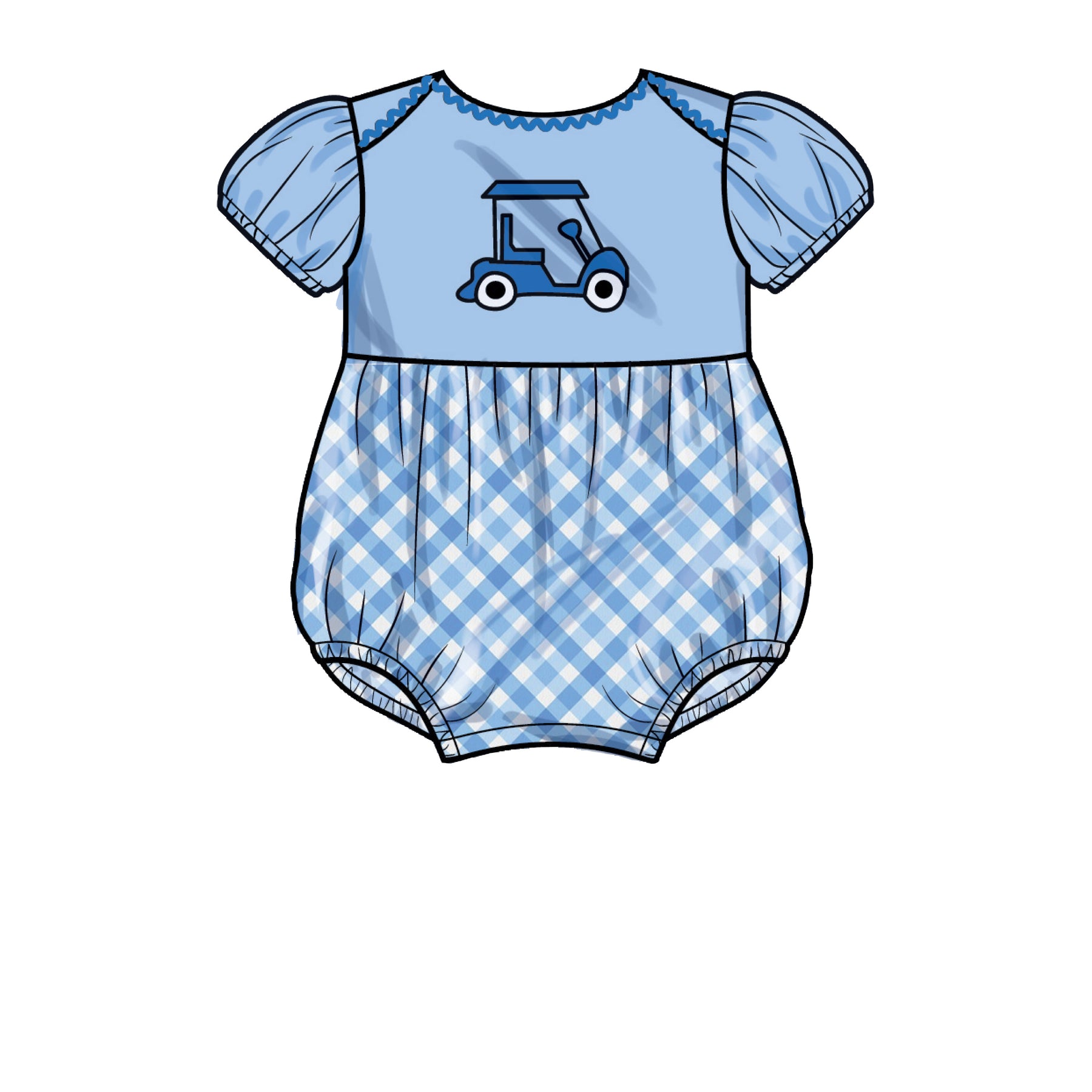 Strampler mit oder ohne geraffte Röcke sind mit gekauften Verzierungen und Applikationen versehen und haben einen unsichtbaren Rückenreißverschluss und eine Öffnung mit Druckknopfleiste.
