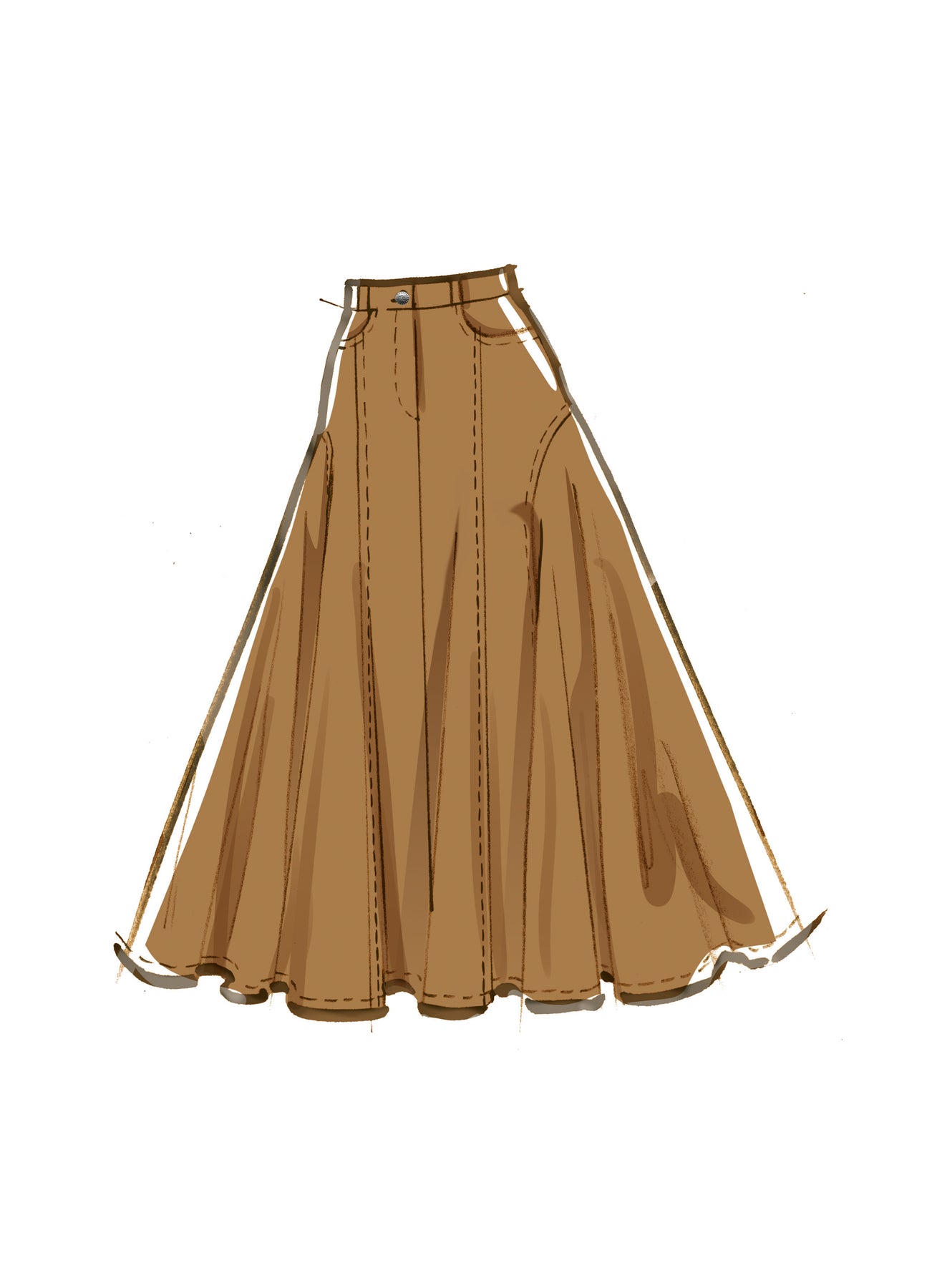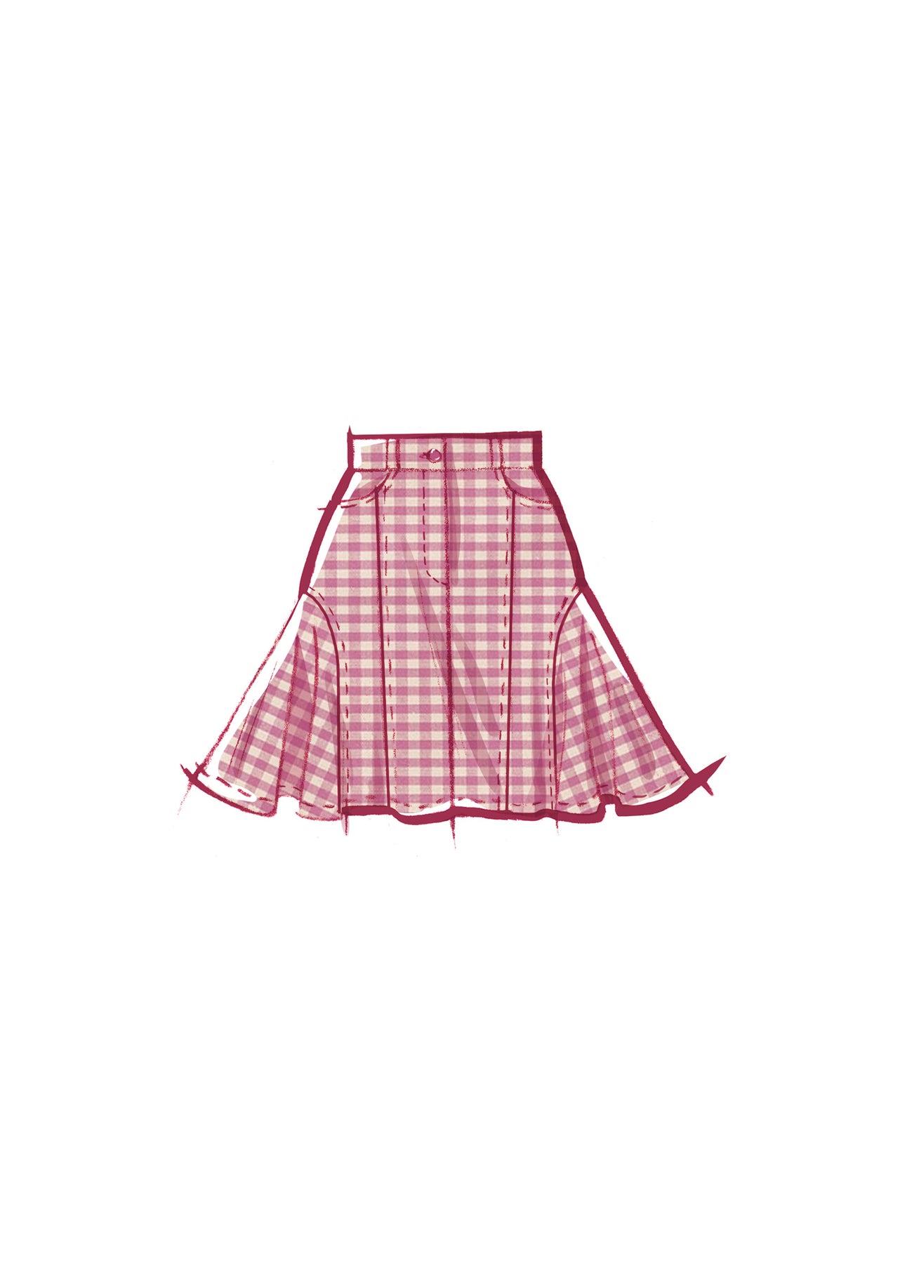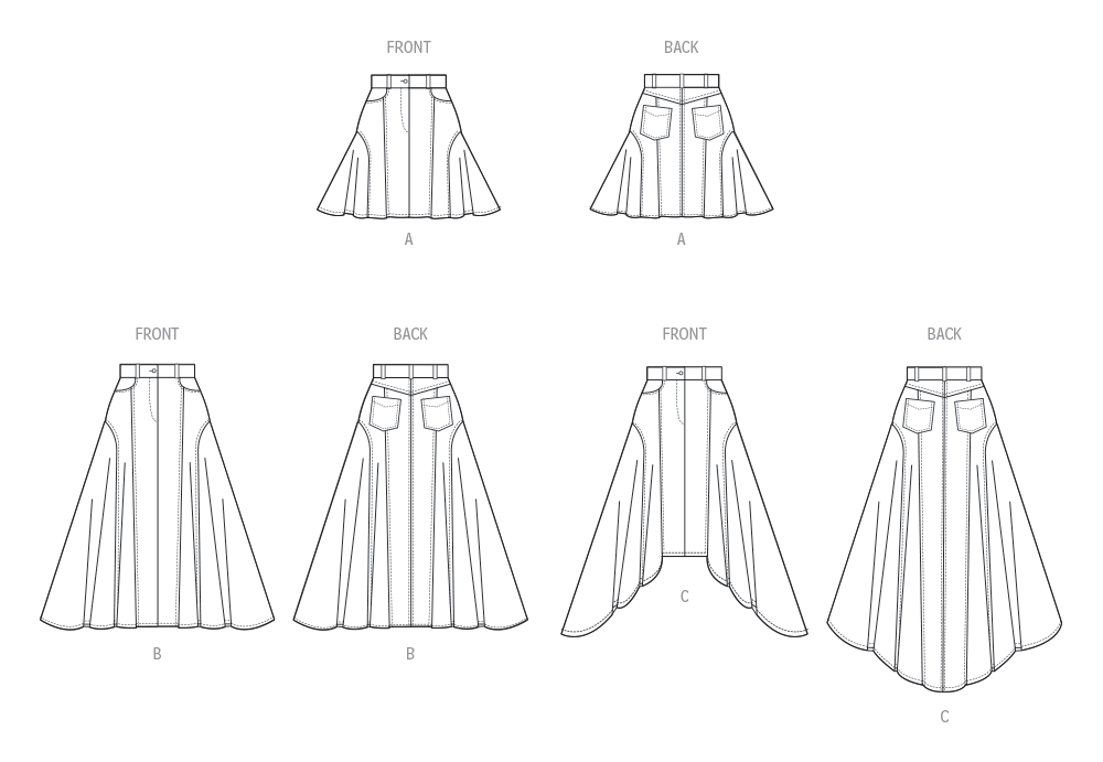 Röcke mit Fly-Front haben Nahtdetails, Rückenpasse, Taschen und Längenvariationen. Der Rock in Ansicht C hat einen hochgeschlossenen Saum.