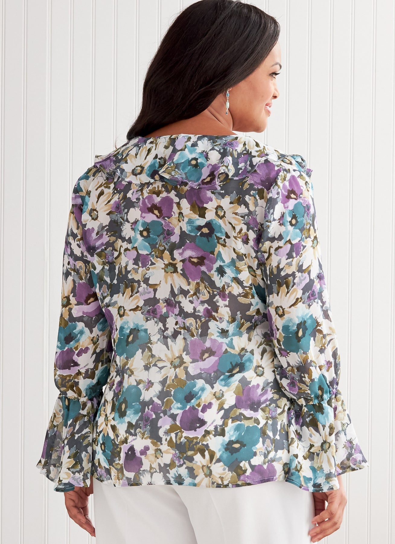 STOFFE: *Mit Flor **Ohne Flor ***Mit oder ohne Flor Viskose, Crepe De Chine, Doppelgeorgette, Satin. Hinweis: Der Stoffbedarf berücksichtigt Flor, einseitiges Design oder Schattierungen. Zusätzlicher Stoff kann erforderlich sein, um das Design anzupassen oder für Schrumpfung.
