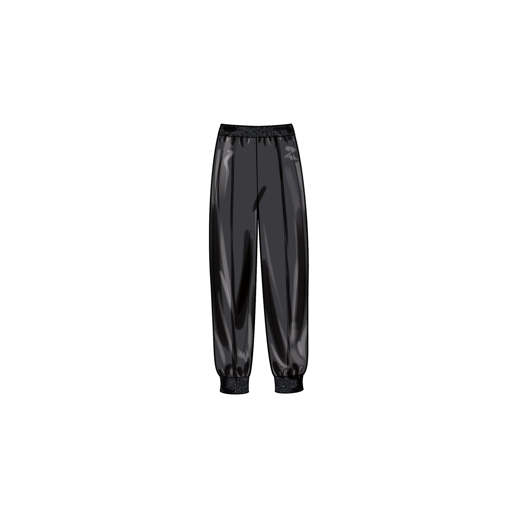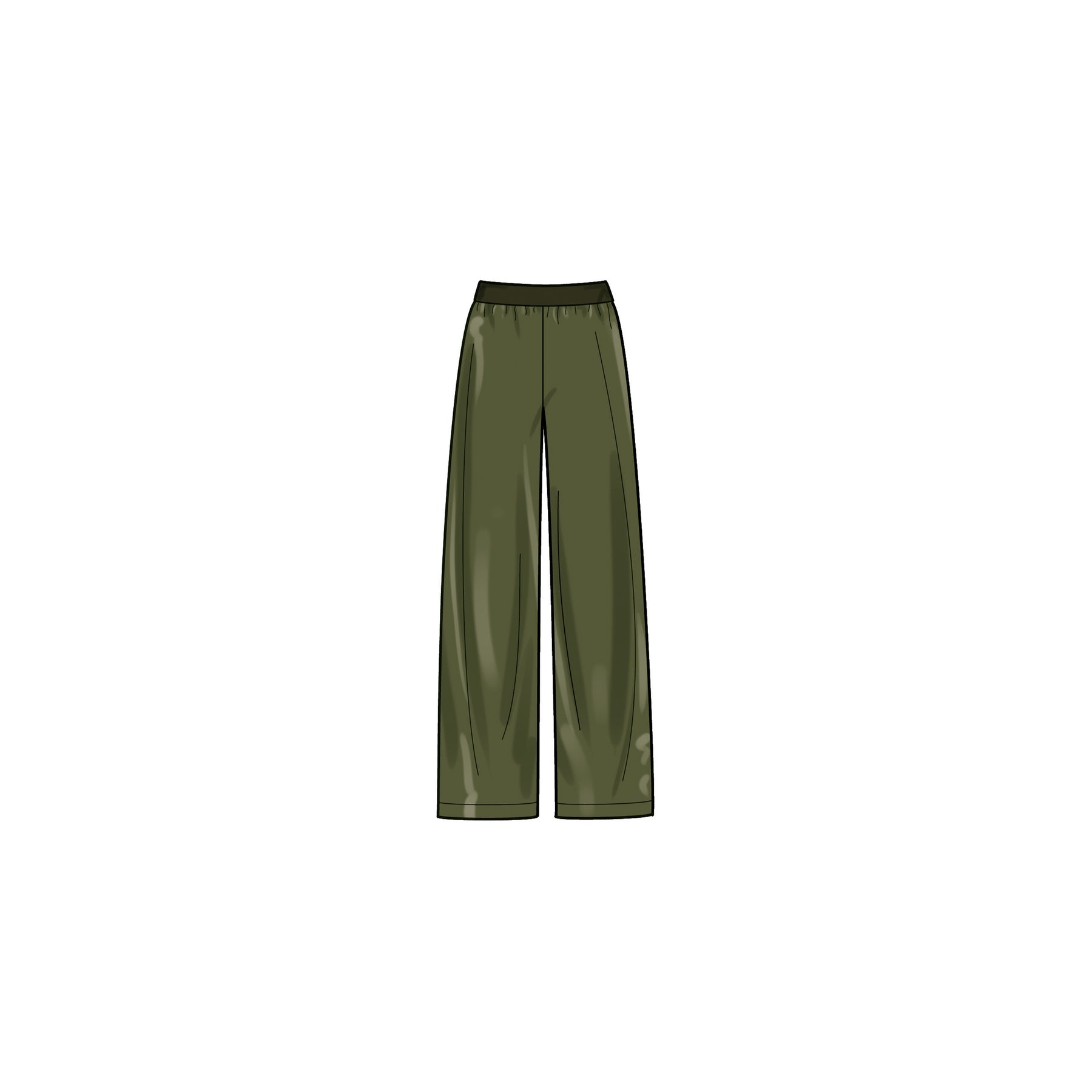 Oberteil A mit kalter Schulter hat einen Rundhalsausschnitt und lange Ärmel. Oberteil B ist kurzärmelig. Die Hosen C und D haben einen gestrickten Kontrast am Bund. Die Jogginghose D hat Knöchelbündchen und Biesen.