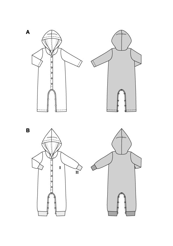 Stoffempfehlung:Leichte Strickstoffe, Jersey, Sweatshirtstoffe, Fleece B II: Bündchenware AB: Aufbügelbare Einlage, 1 Zwillingsnadel, 9 Jerseydrücker zum Einnieten. A: 6 Knöpfe. B: 6 Druckknöpfe zum Einnieten.