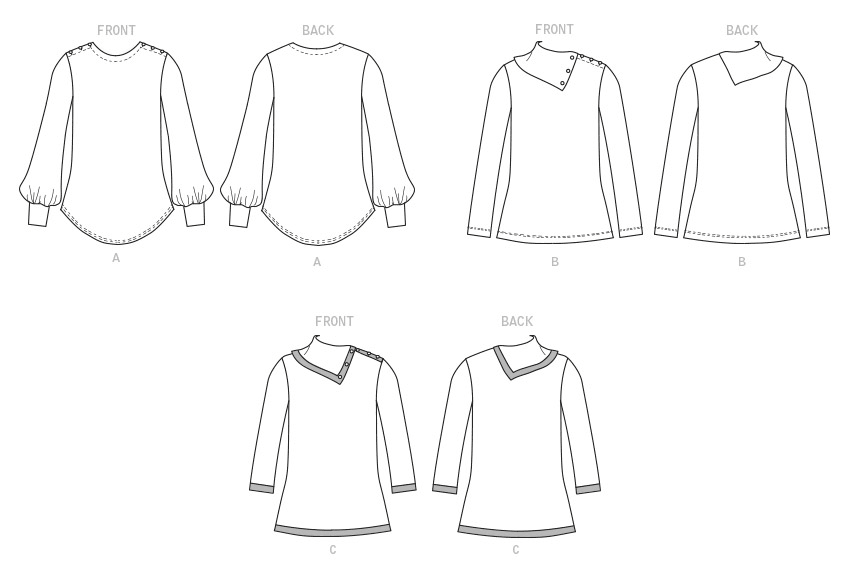 Stoffempfehlung:French Terry, Pulloverstrick. Nicht geeignet für offensichtliche Diagonalen. *Mit Flor **Ohne Flor ***Mit oder ohne Flor. Mäßig dehnbares Gestrick (35% Cross Grain) Jersey, Interlock, Hinweis: Der Stoffbedarf erlaubt Flor, einseitiges Design oder Schattierungen. Zusätzlicher Stoff kann zur Anpassung an ein geeignetes Design oder für Schrumpfung erforderlich sein.
