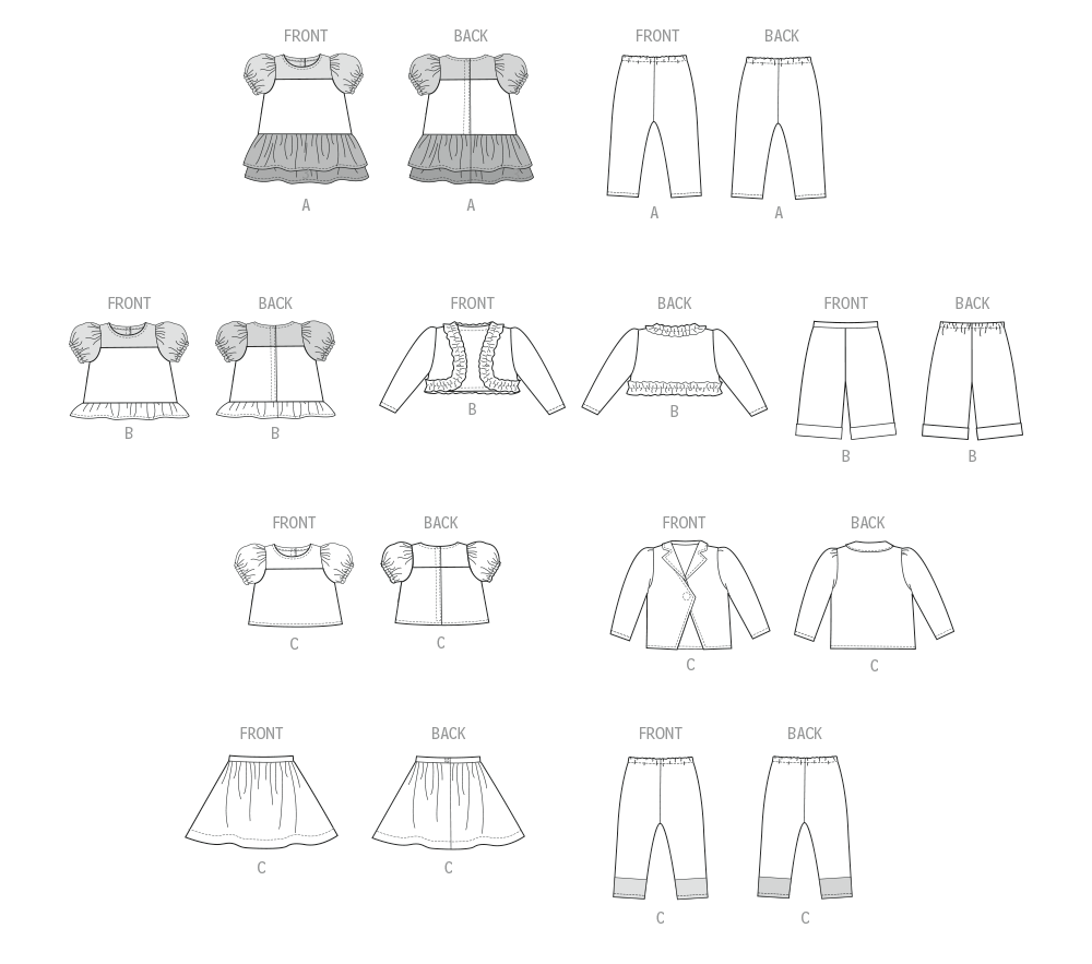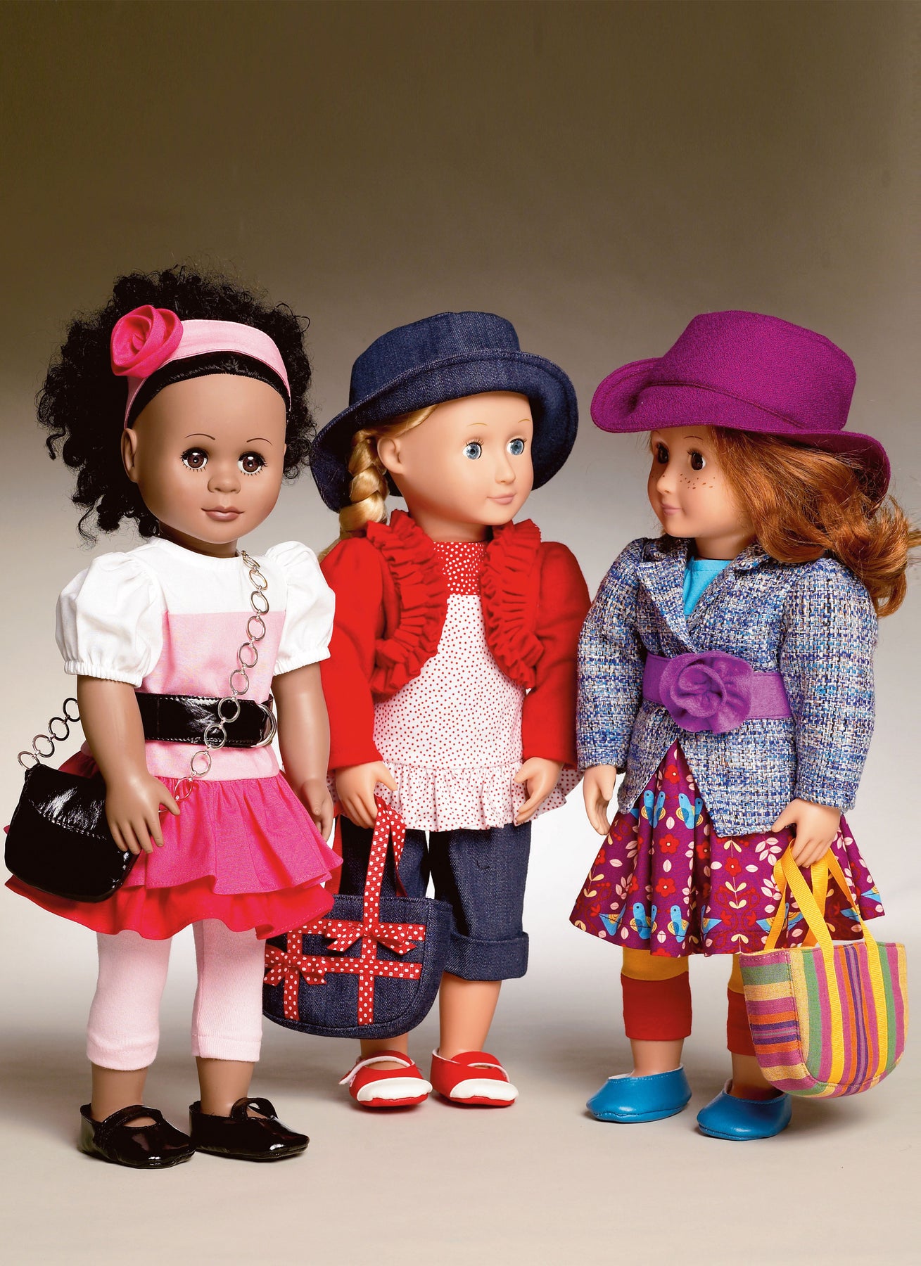 Drei Outfits für 18"-Puppen. Outfit A: Kleid, Leggings und Stirnband. Outfit B: Bolero, Oberteil, Hut und Hose. Outfit C: Jacke, Oberteil, Hut, Rock und Leggings.