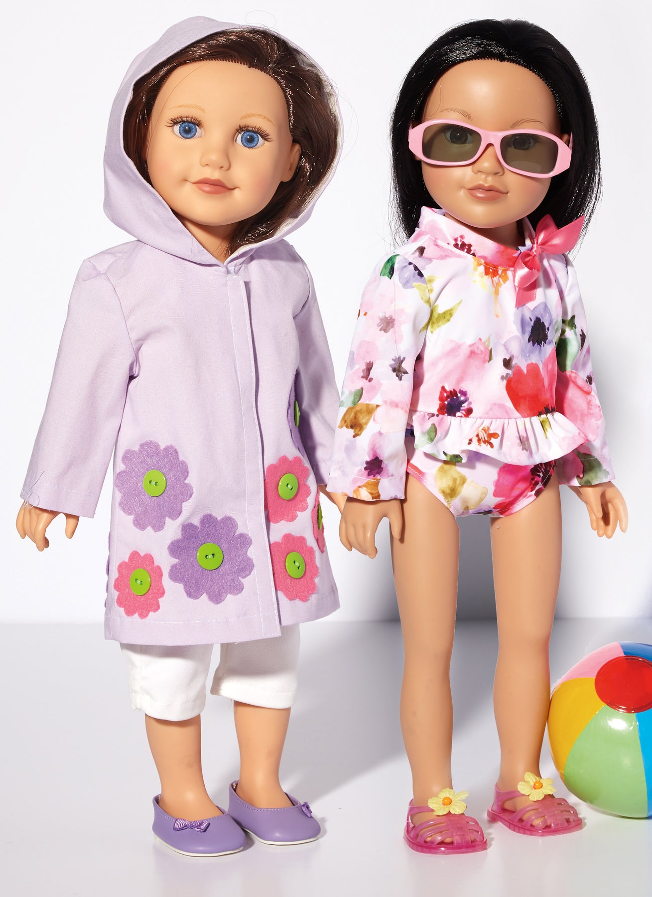 Frühlings- und Sommeroutfits für 18"-Puppen: Bademantel mit Filzblumen und Frontverschluss, Strampler mit Rüschen in zwei Längen, Wickelkleid, Oberteil und Hose sowie langärmeliges Badeanzug-Oberteil mit Rückenverschluss und Höschen. Siehe Umschlag für weitere Informationen.