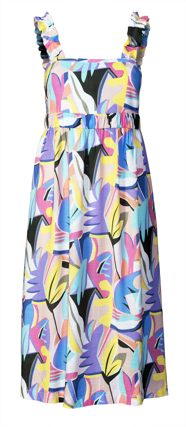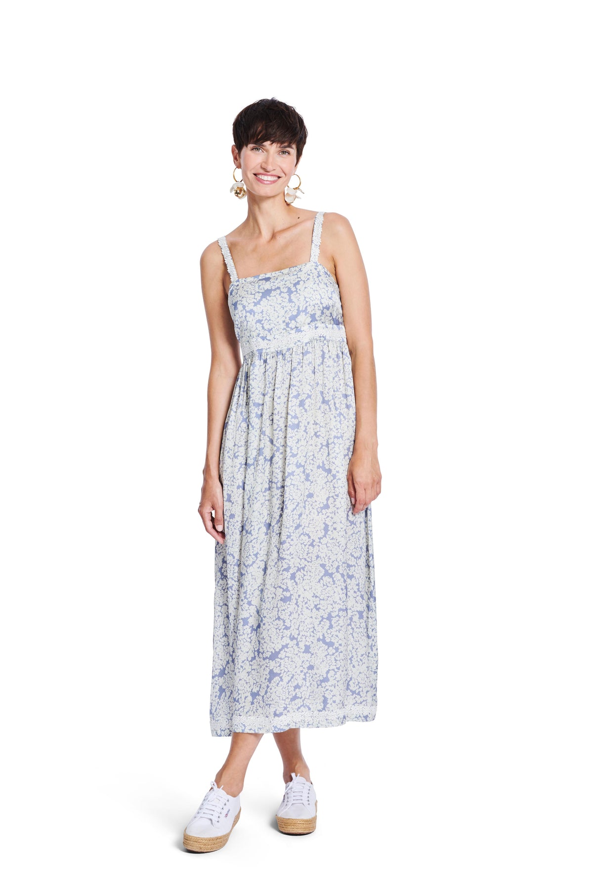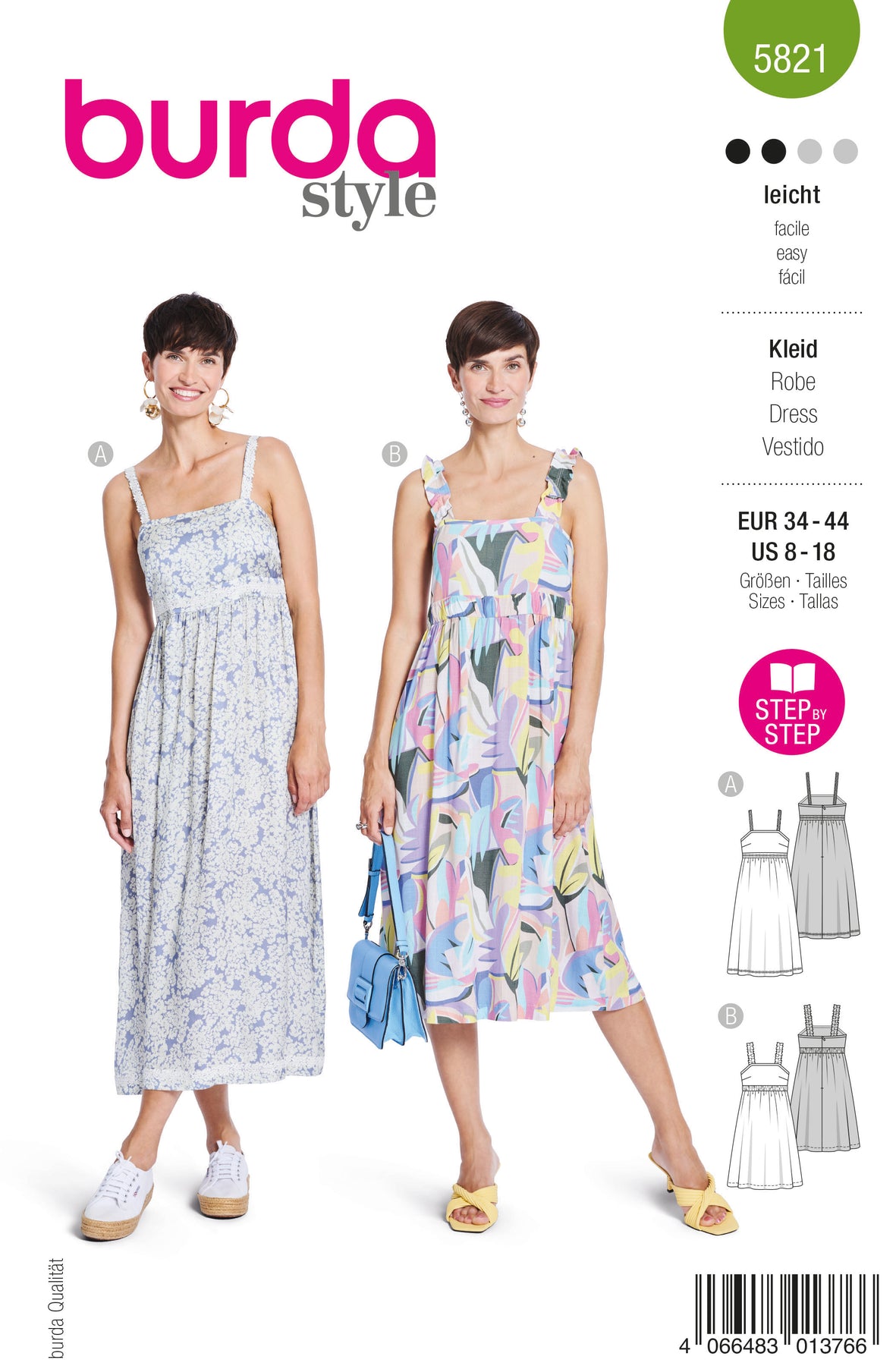 Dieses Kleid eignet sich perfekt für Gartenpartys oder Sommer-Hochzeiten und ist super einfach selbst genäht. Die Spitzenborten an den Trägern und am Saum verleihen ihm seinen romantischen Charme. Das Midi-Kleid mit Rüschenträgern sieht übrigens auch in Maxi-Länge echt toll aus und formt mit der gerafften Empirenaht eine sommerliche Silhouette. Zwei stilvolle Kleiderschnitte auf Nählevel 1!