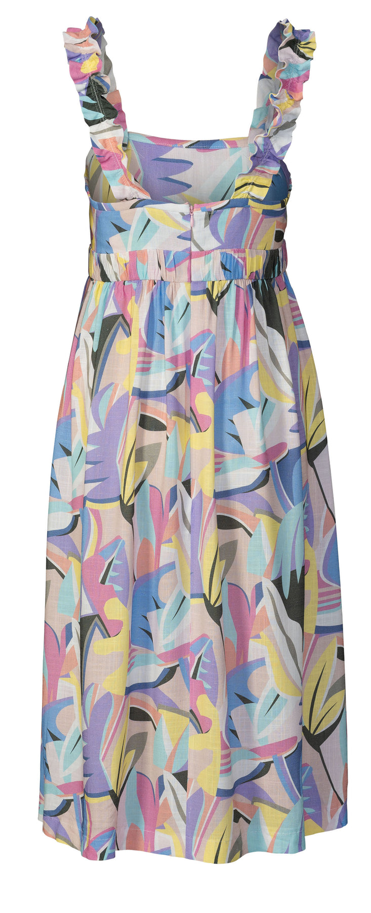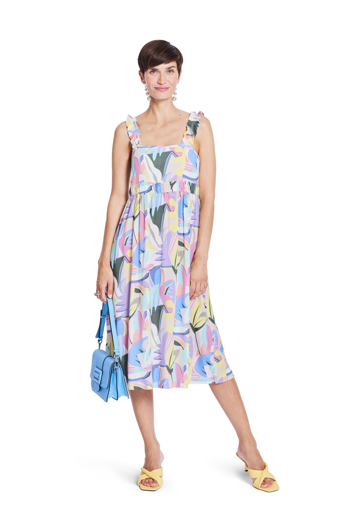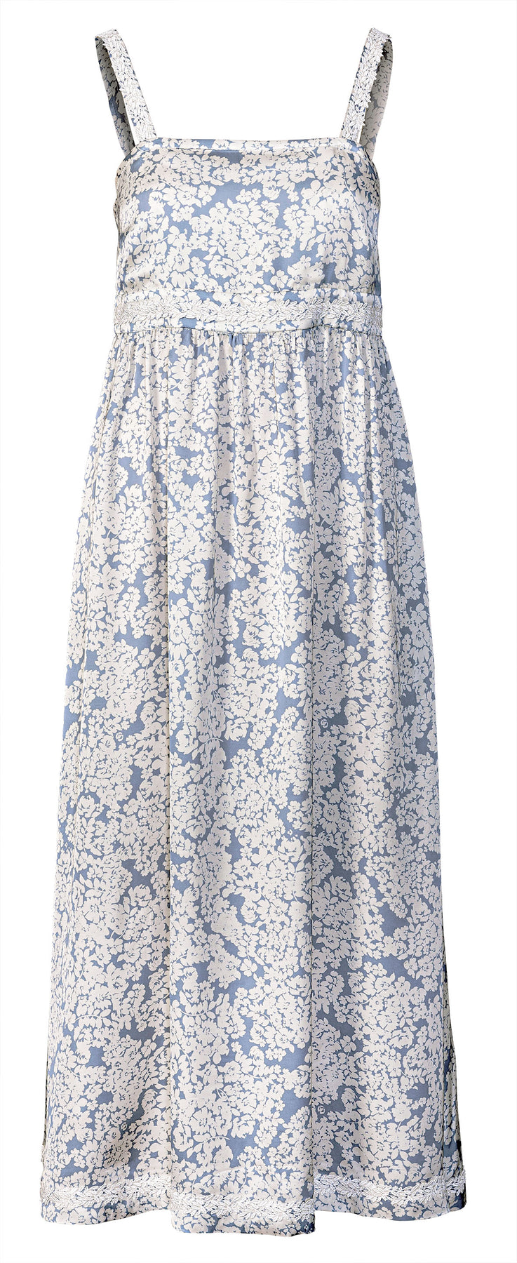 Dieses Kleid eignet sich perfekt für Gartenpartys oder Sommer-Hochzeiten und ist super einfach selbst genäht. Die Spitzenborten an den Trägern und am Saum verleihen ihm seinen romantischen Charme. Das Midi-Kleid mit Rüschenträgern sieht übrigens auch in Maxi-Länge echt toll aus und formt mit der gerafften Empirenaht eine sommerliche Silhouette. Zwei stilvolle Kleiderschnitte auf Nählevel 1!