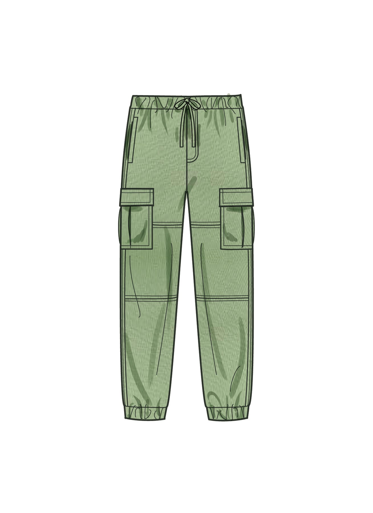 Das Hemd hat einen separaten Kragen und ein Band, eine überschnittene Schulter, lange Ärmel mit Bündchen und aufgesetzte Brusttaschen. Die Hose im Cargostil hat elastische Knöchel und Bündchen sowie einen Kordelzug, eine Faux-Fly-Front, Seitennahttaschen und Cargotaschen, die auf die Seitennähte aufgesetzt sind.