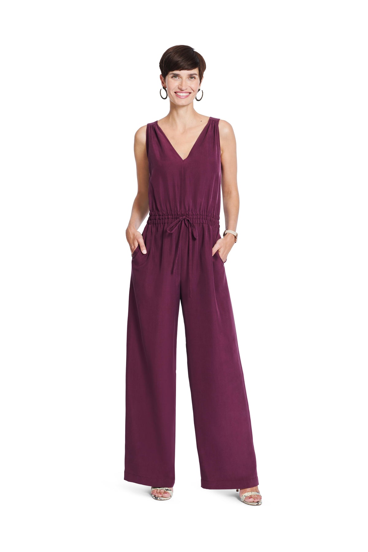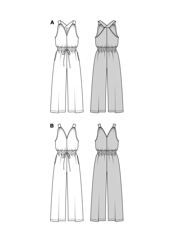 Unser Schnittmuster-Set mit zwei stilvollen Jumpsuits: nähe mit burda style einen praktischen Overall mit tiefem V-Ausschnitt und Taschen oder einen eleganten Seidenjumpsuit mit Kräuselträgern und Tunnelzug für vielseitigen Stil - beides auf Nählevel 3. Zwei Must-Have-Schnitte in einem Set!