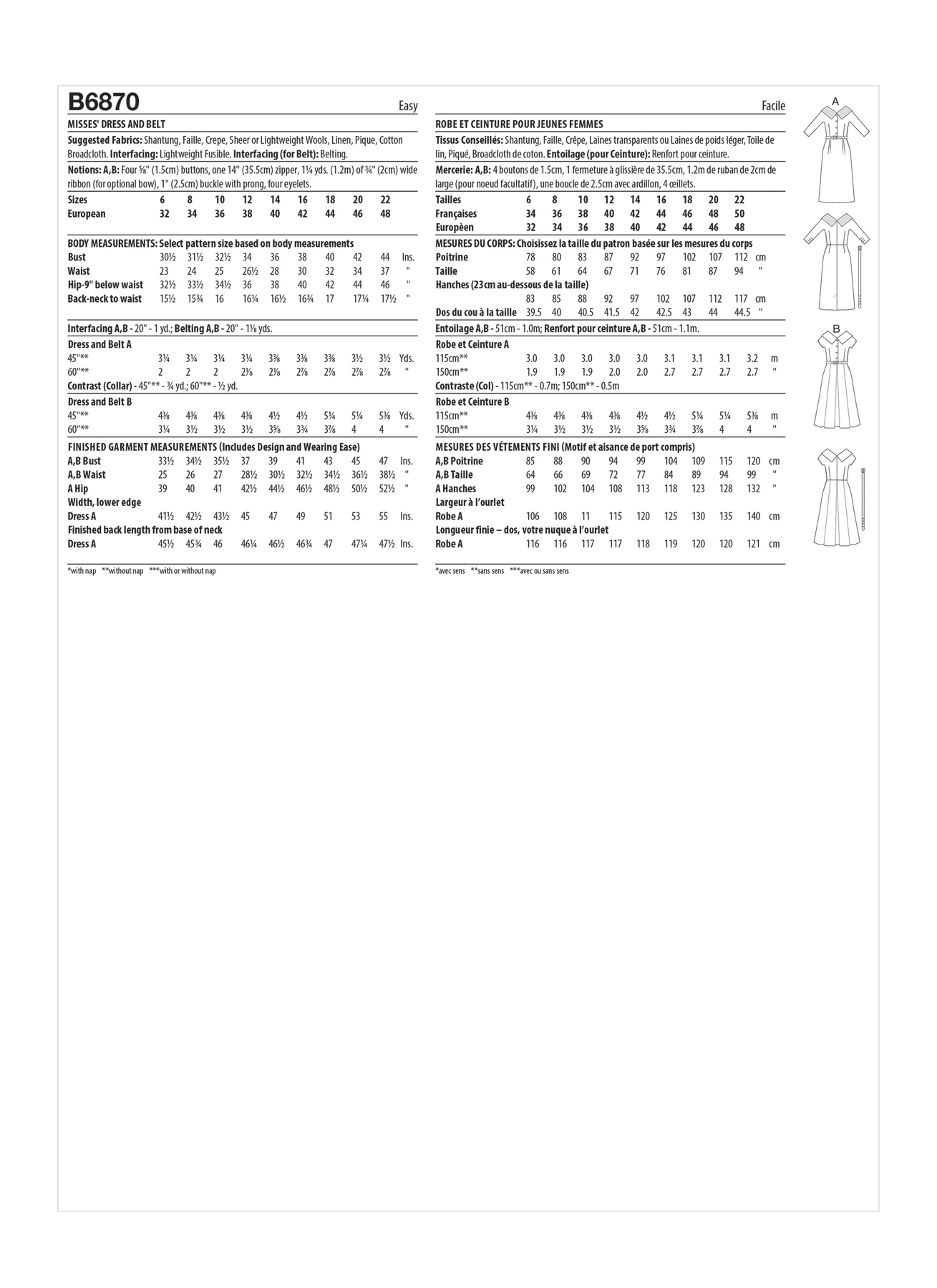 Butterick Schnittmuster B6870 Damen Kleid und Gürtel