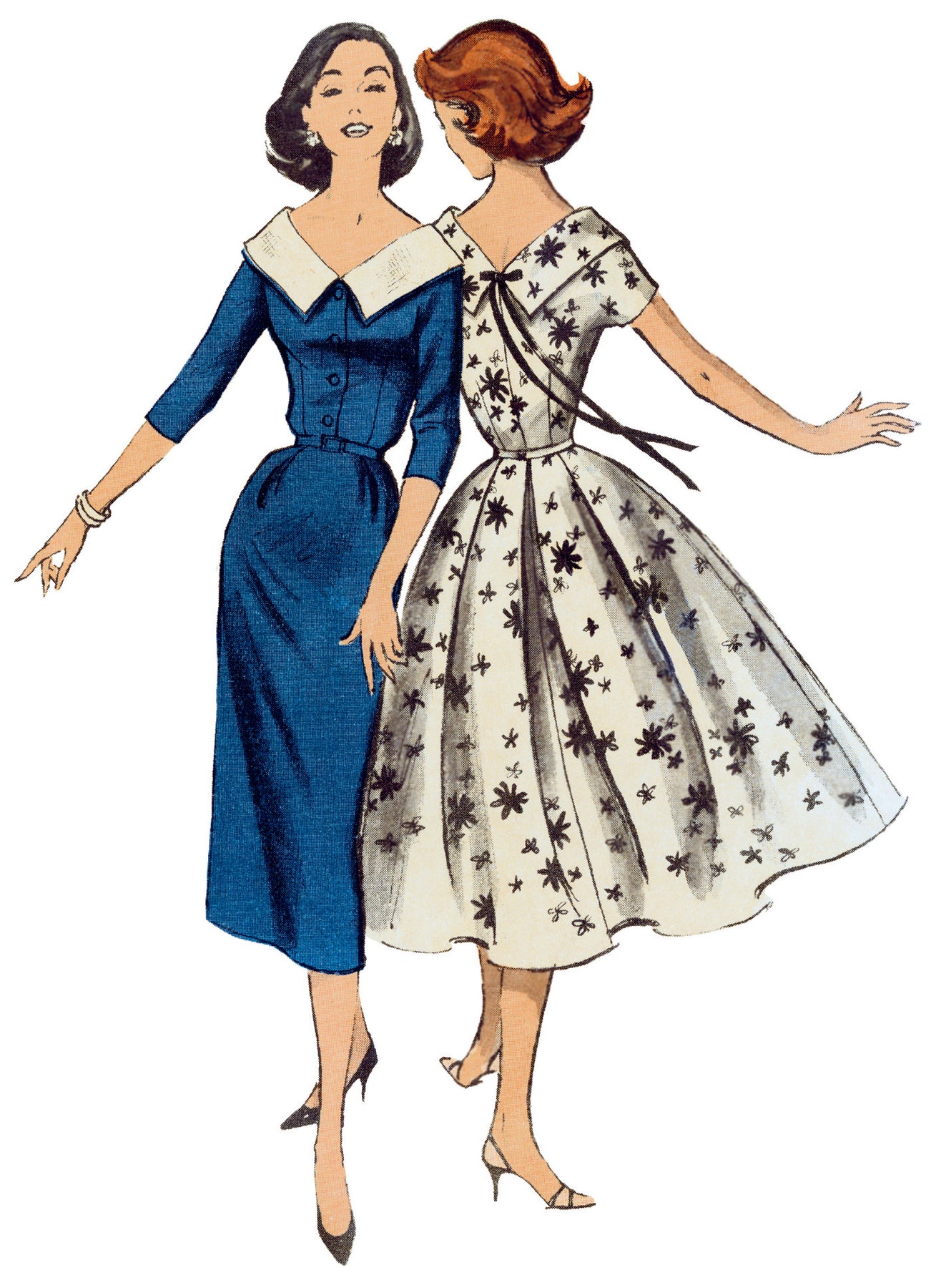 Schlankes Kleid oder Kleid mit vollem Rock, mit abnehmbarem Kragen und geknöpftem Mieder. Ansicht A hat einen abnehmbaren Kragen in Kontrastfarbe, Ärmel unterhalb des Ellenbogens und ein Oberteil mit Zapfen. Ansicht B hat eine Kontrastschleife im Rücken, keinen Überkragen und kurze Ärmel.