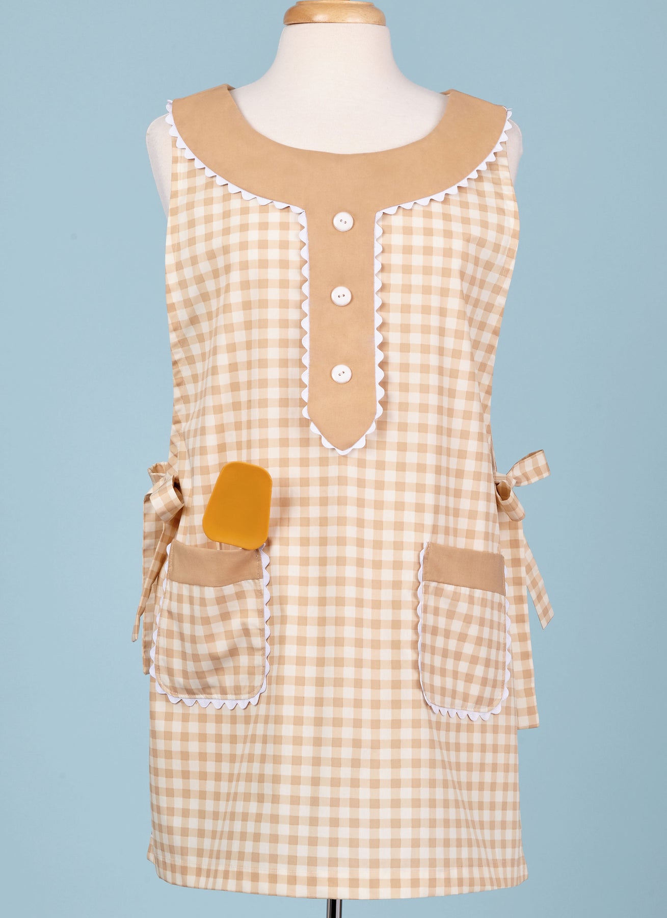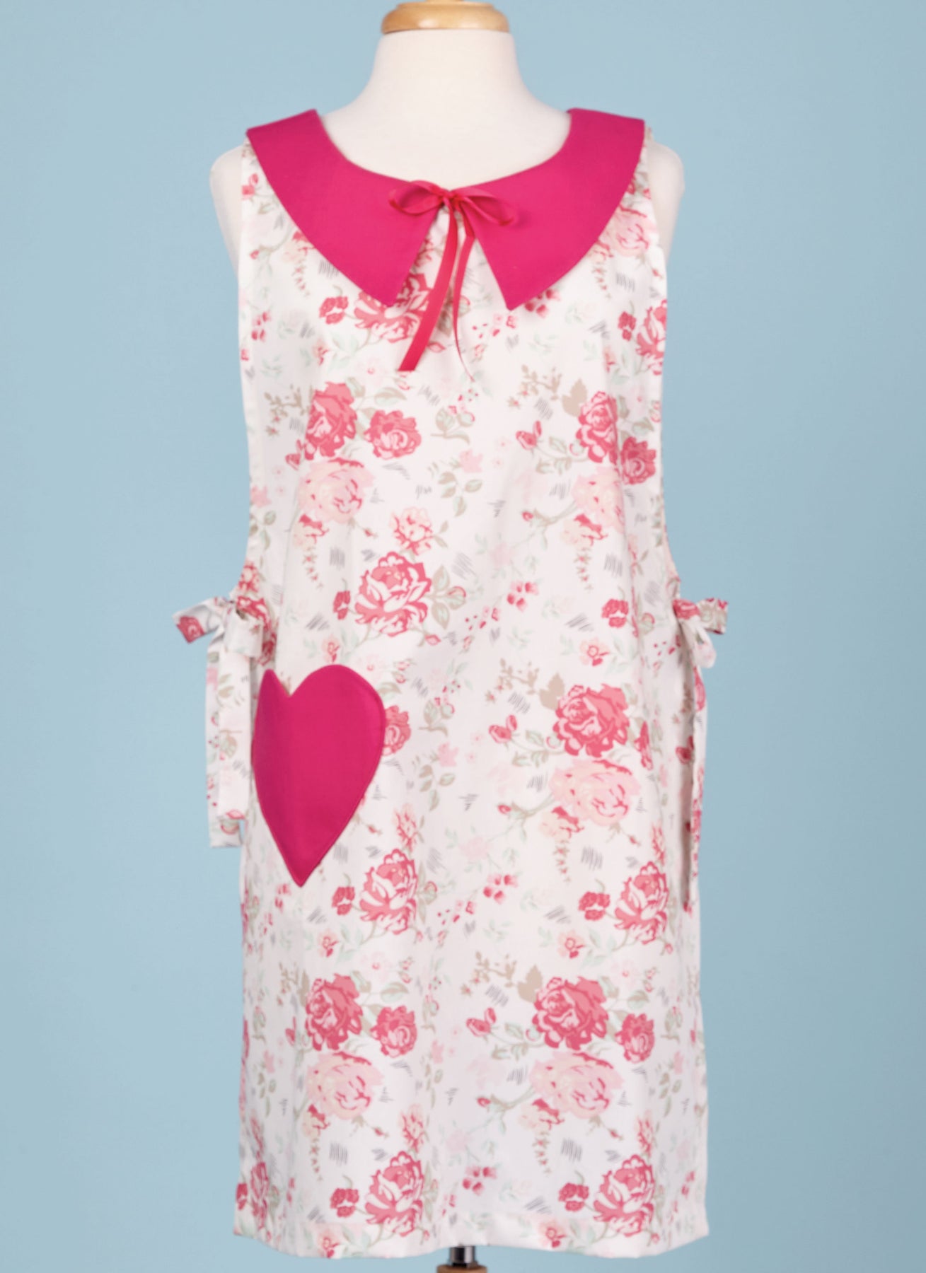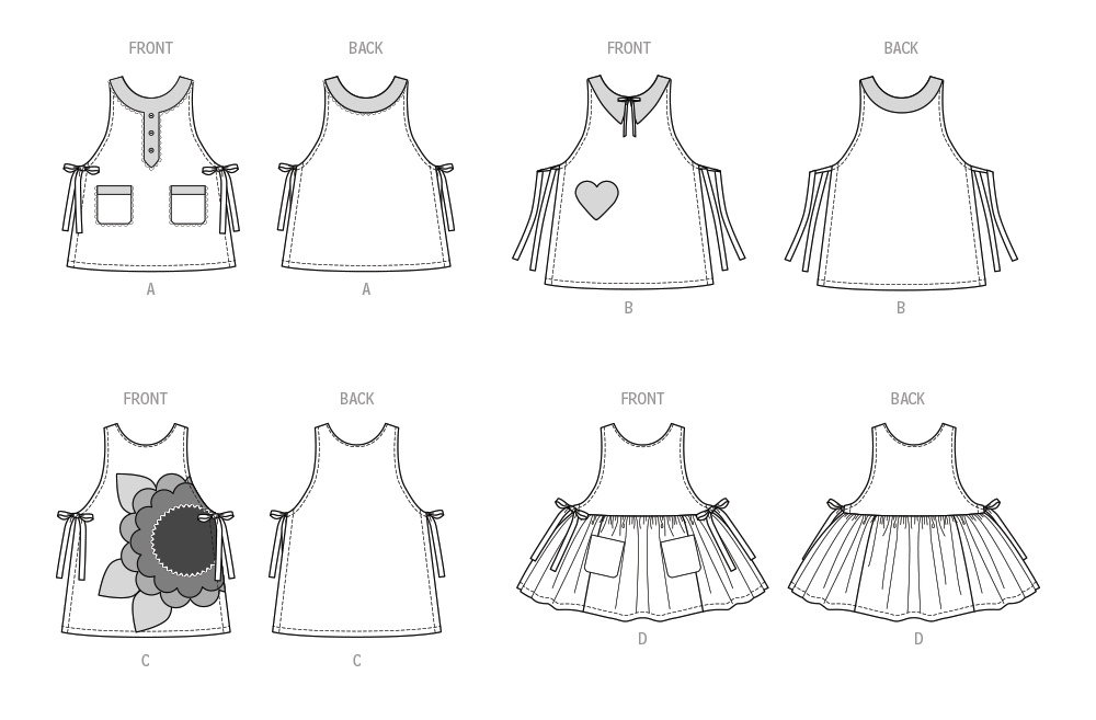 Die Schürzen werden an den Seiten gebunden. Ansicht A hat Taschen mit Bändern und einen dekorativen Kragen. Ansicht B hat einen spitzen Kragen mit einer Schleife und eine Herztasche. Ansicht C hat eine große Blumenapplikation. Ansicht D hat einen gerafften Rock und Taschen.