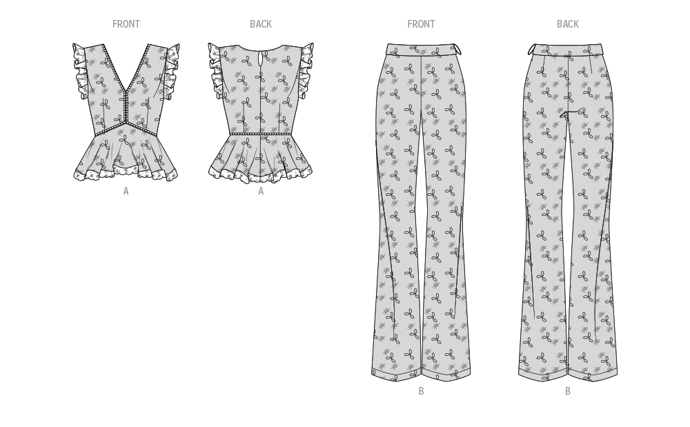 Kreieren Sie dieses süße Spitzenset für Misses Größe 8-26. Das Schößchenoberteil hat einen gekauften gerafften Spitzenbesatz an den Ärmeln und am Saum, einen gekauften Besatz am Halsausschnitt und an der Taille sowie einen unsichtbaren Reißverschluss hinten. Die bodenlange Hose hat Abnäher am Rücken und einen unsichtbaren Reißverschluss an der Seitennaht.