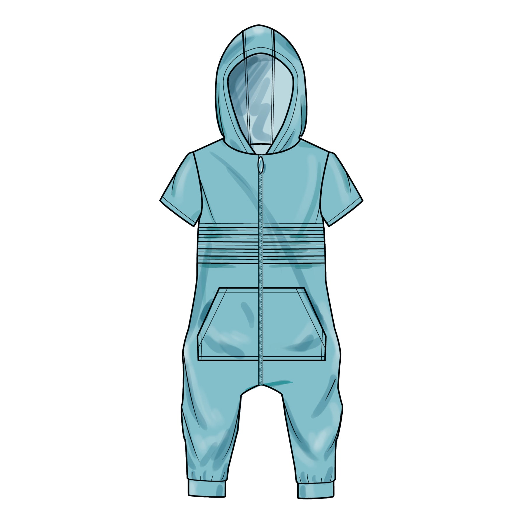 Jumpsuit für Kleinkinder zum Überziehen mit Reißverschluss vorne. Vordertaschen und Nahtdetails. Kurze oder lange Ärmel. Ärmellose Variante. Nur für Stretch-Strickwaren geeignet.
