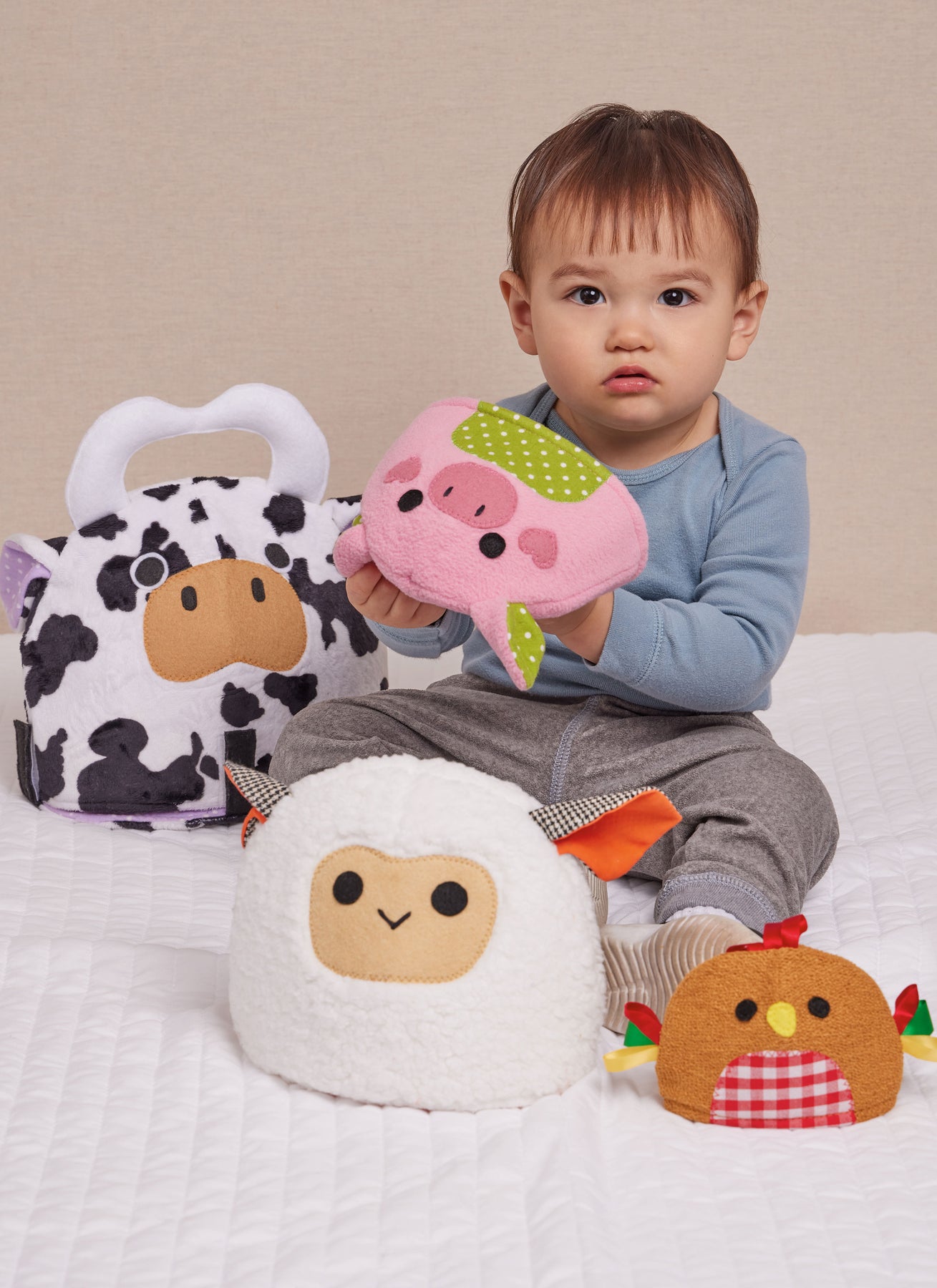 Weiche Tiere in fünf Größen, die sich ineinander schachteln lassen. Die Kuh hat Klettbandlaschen und wird an den Horngriffen getragen. Die Nasen der Schafe und Schweine sind appliziert und leicht zu besticken, die Augen der Maus sind mit einem französischen Knoten versehen.