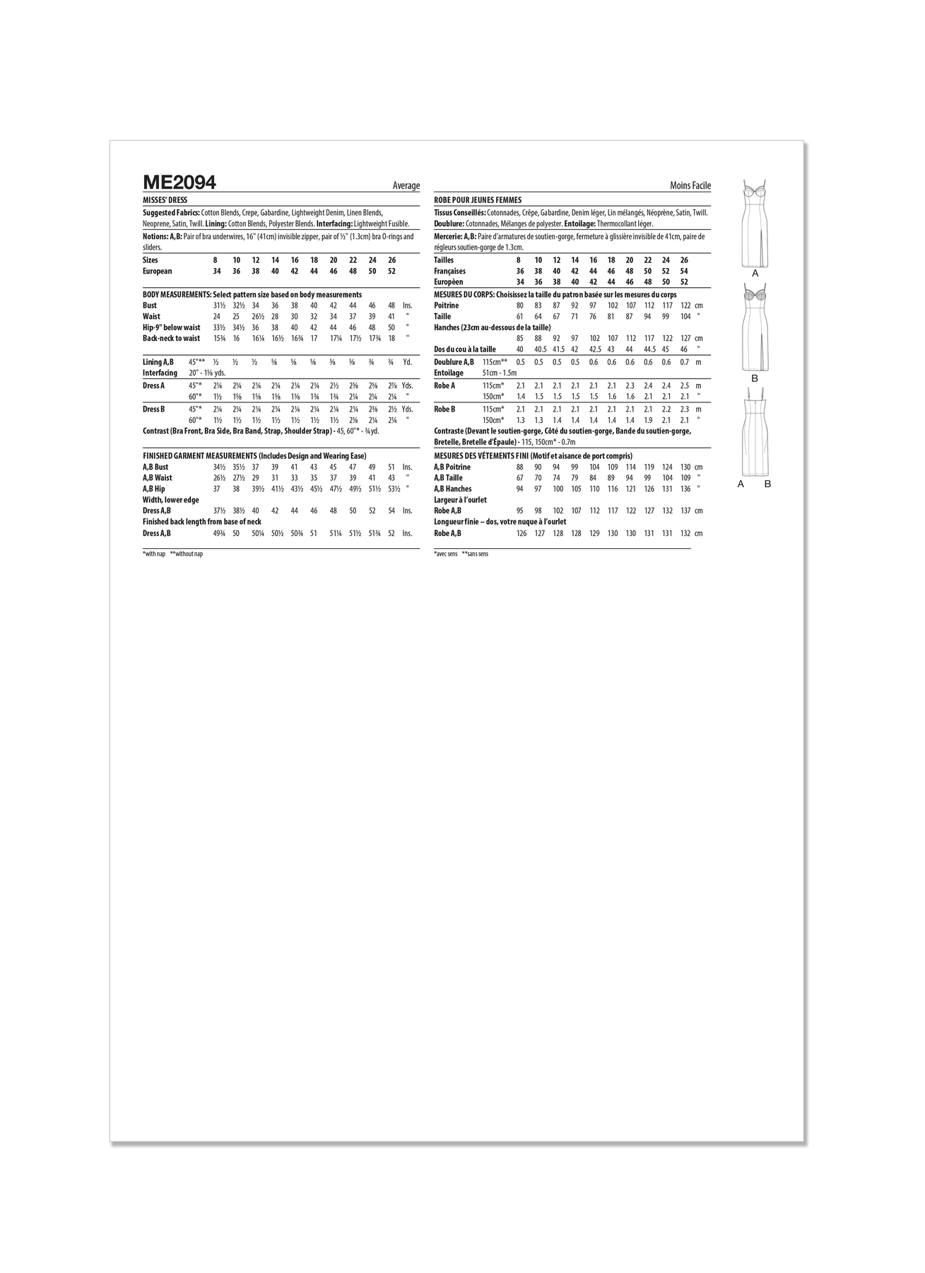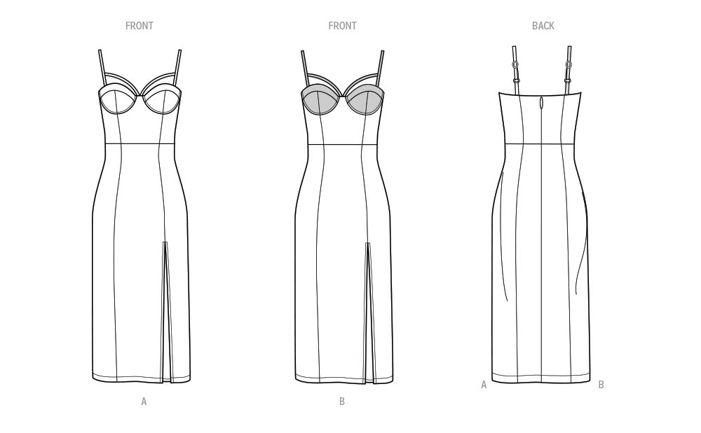 Tailliertes Kleid mit gefüttertem Mieder, Stäbchen an den Prinzessnähten, Bügel-Cups, oberschenkelhohem Schlitz, verstellbaren Trägern und unsichtbarem Reißverschluss hinten. Das Kleid in Ansicht B hat kontrastierende Träger und Cups.