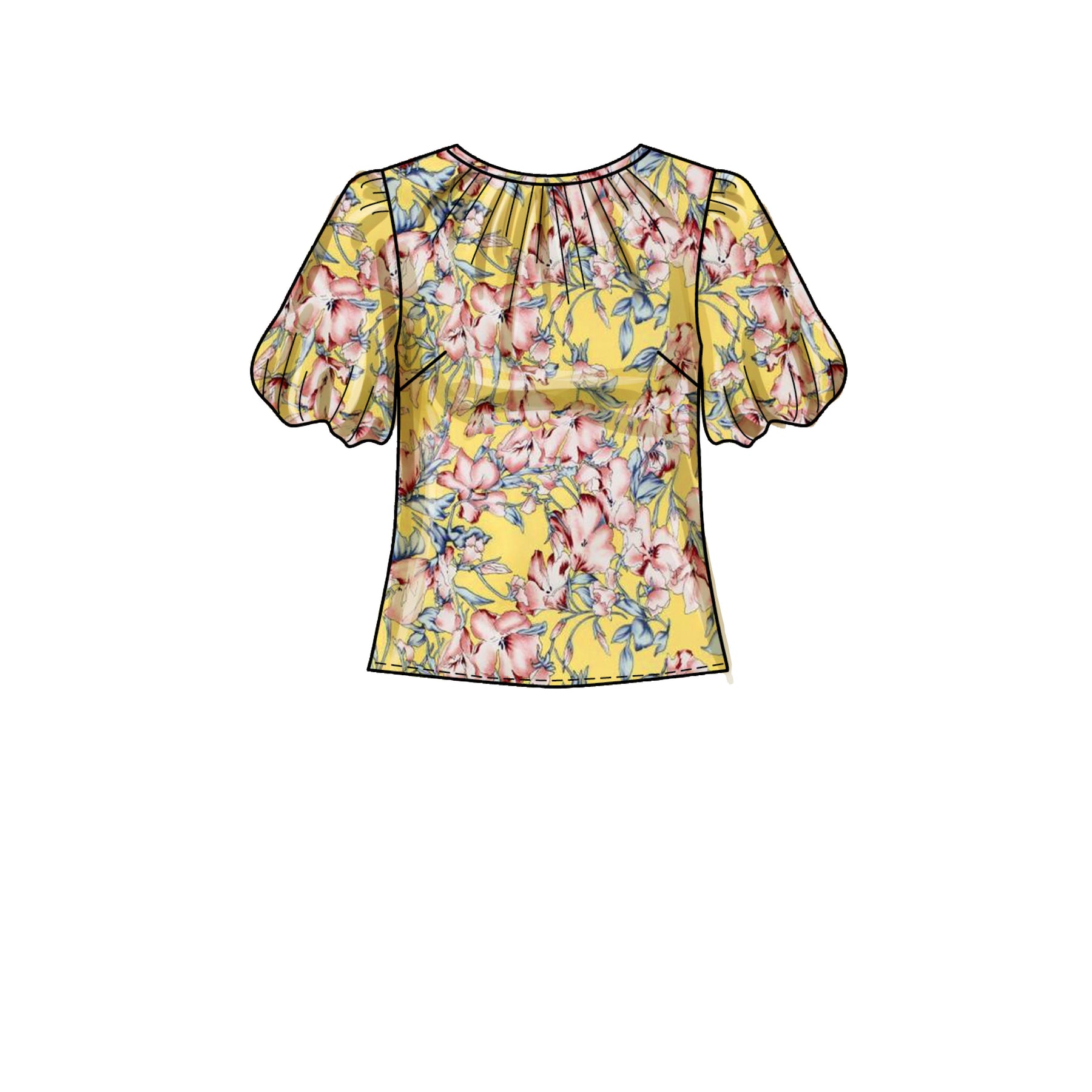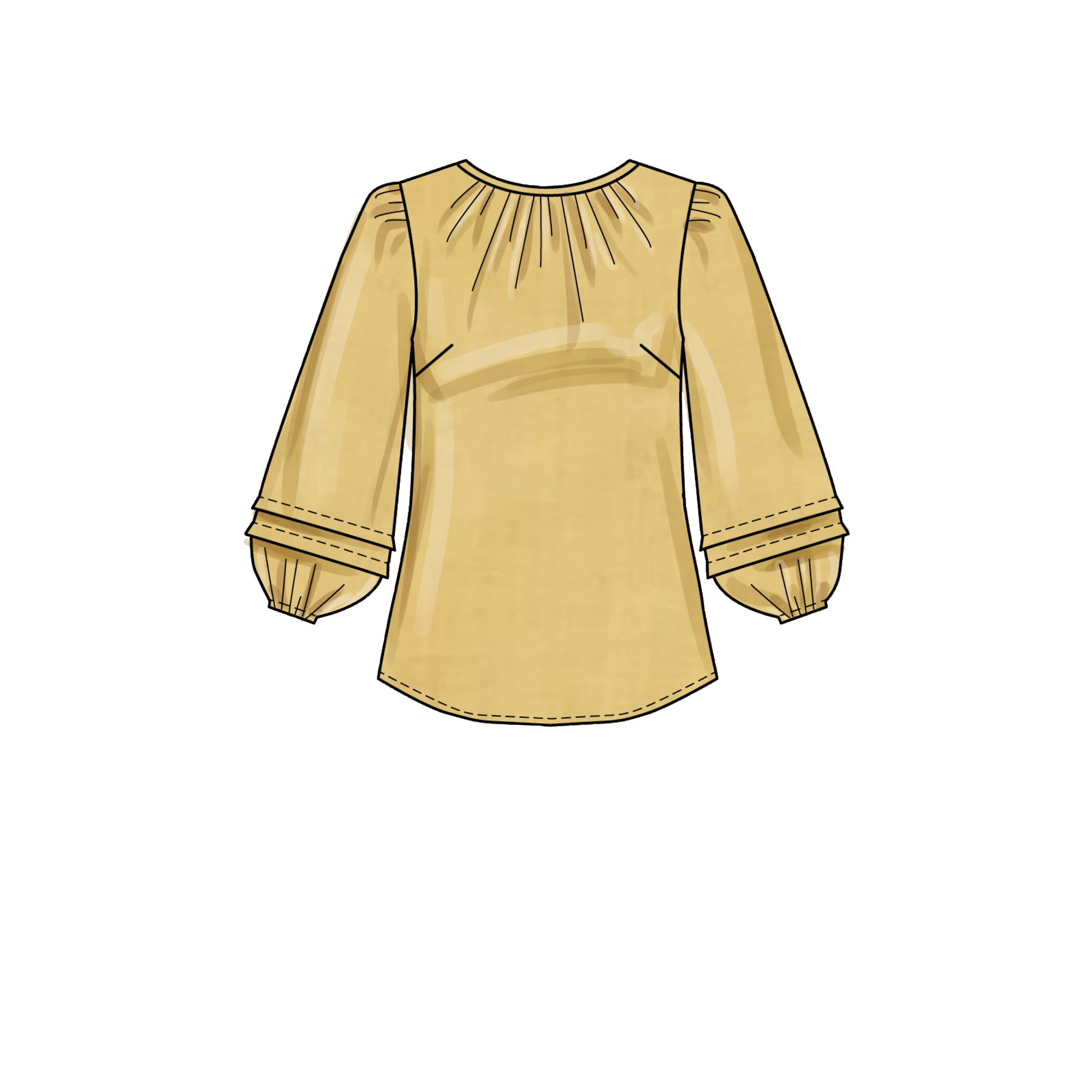 Top und Tunika haben vorne am Halsausschnitt und an den Ärmelenden Raffungen. Der Rückenverschluss hat Knöpfe bis zum Ende des Rückens. Bluse hat Ärmel- und Saumvariationen.