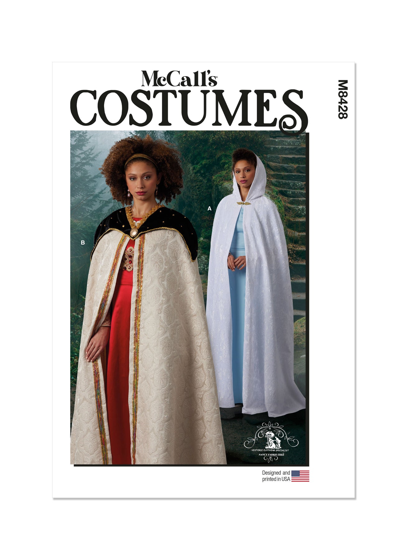 Stoffempfehlung:Umhang A,B: Brokatseide, Pannesamt, Damast, leichte Dekostoffe, Leinen, Satin. Umhang B: Samt. Futter A: Satin/Satin. Capelet-Futter B: Baumwolle/Baumwollmischungen. Einlage B: Leichtes Fixiermaterial
