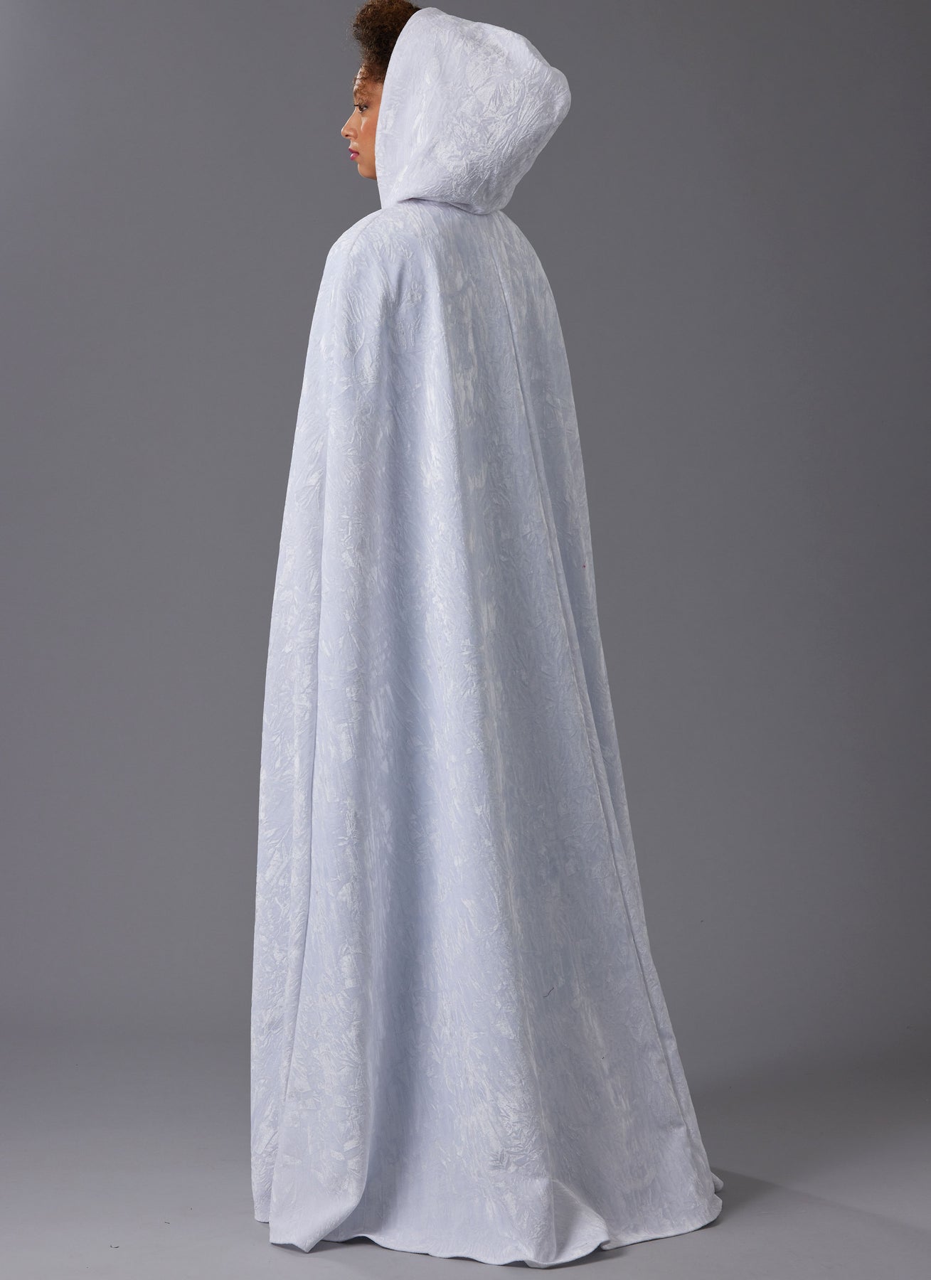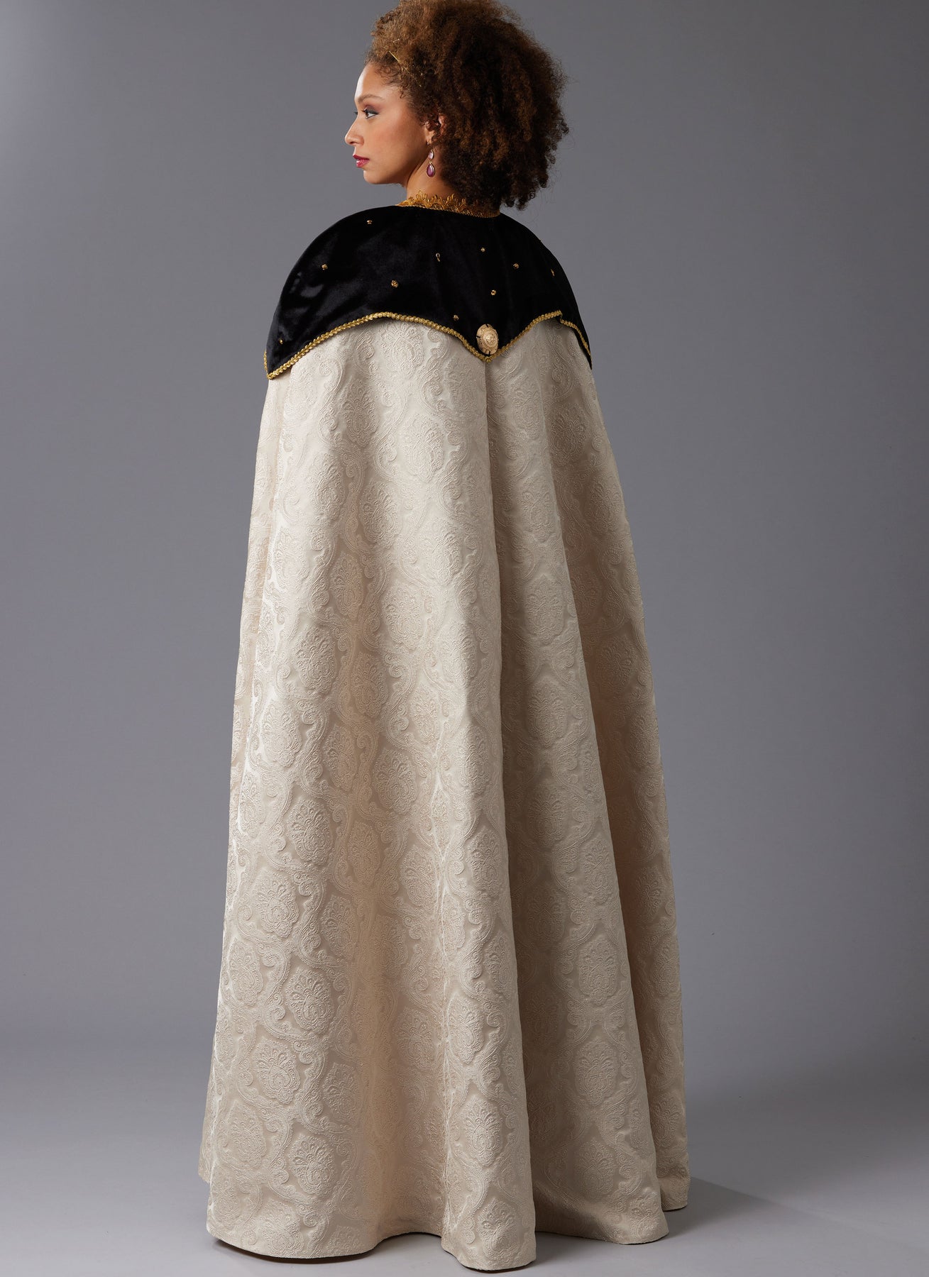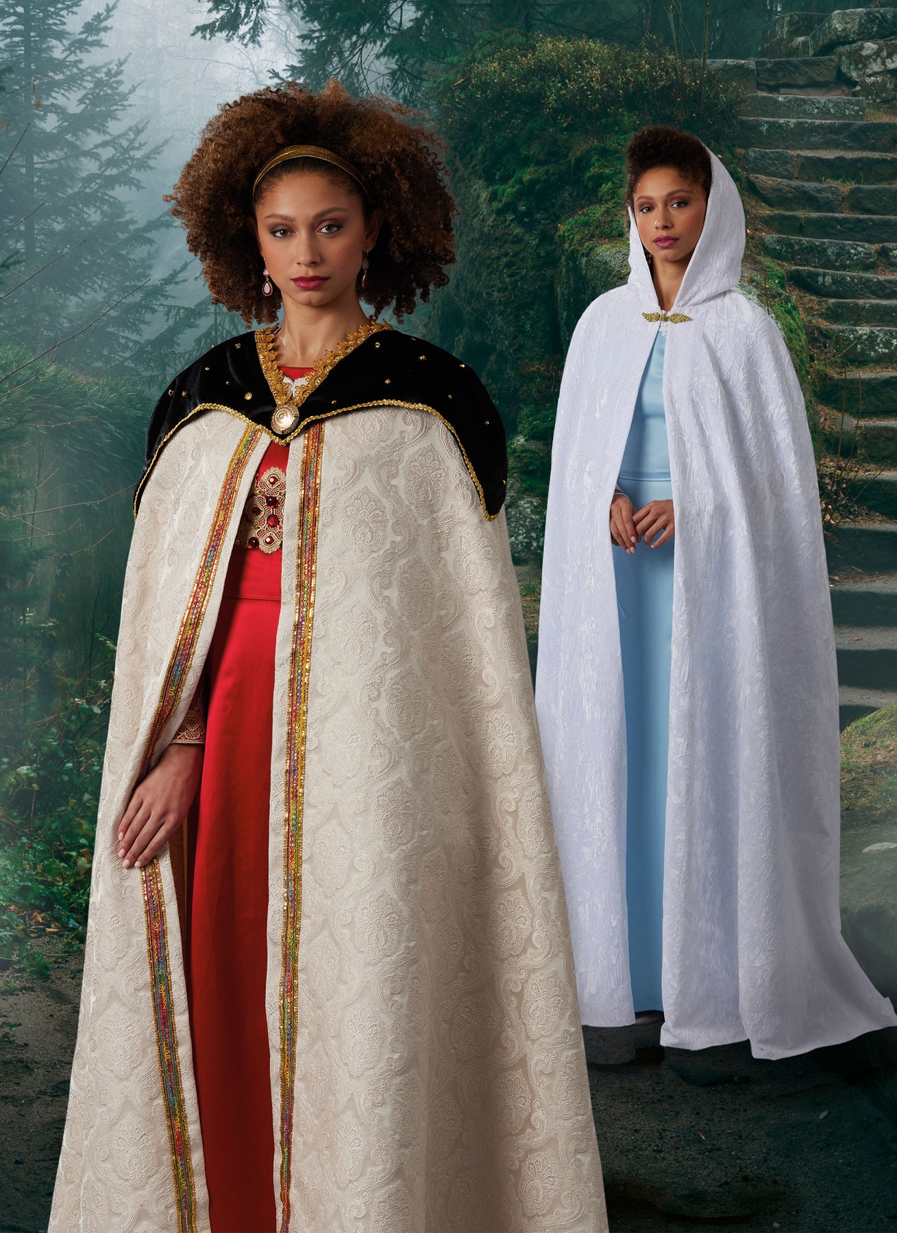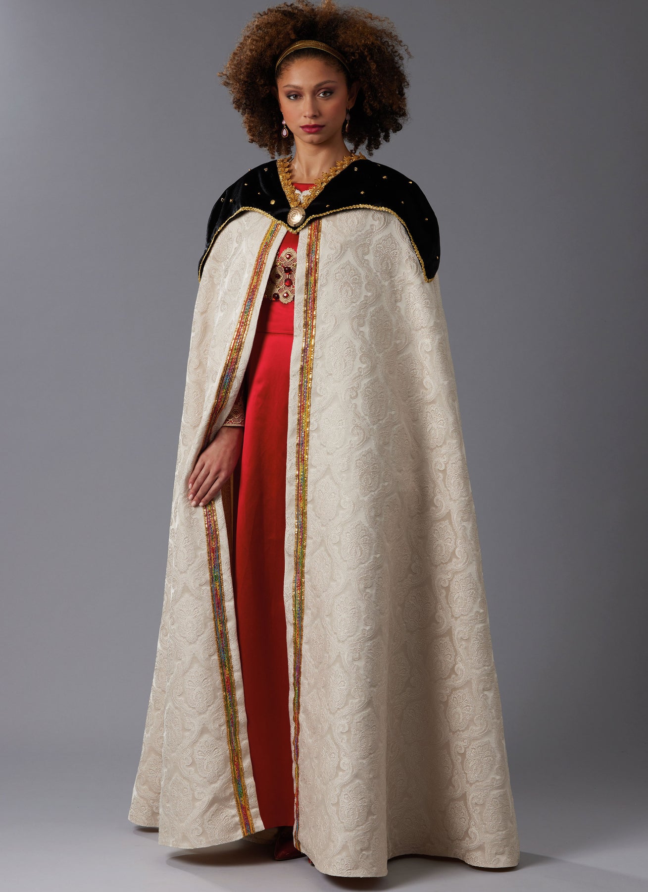 Ungefütterte Umhänge. Ansicht A hat eine gefütterte Kapuze und einen Froschverschluss. Der Umhang von Ansicht B wird vorne geschnürt und mit dem Capelet von Ansicht B getragen. Das Capelet wird über den Kopf gezogen und ist mit Borten, Perlen und großen Medaillons verziert.