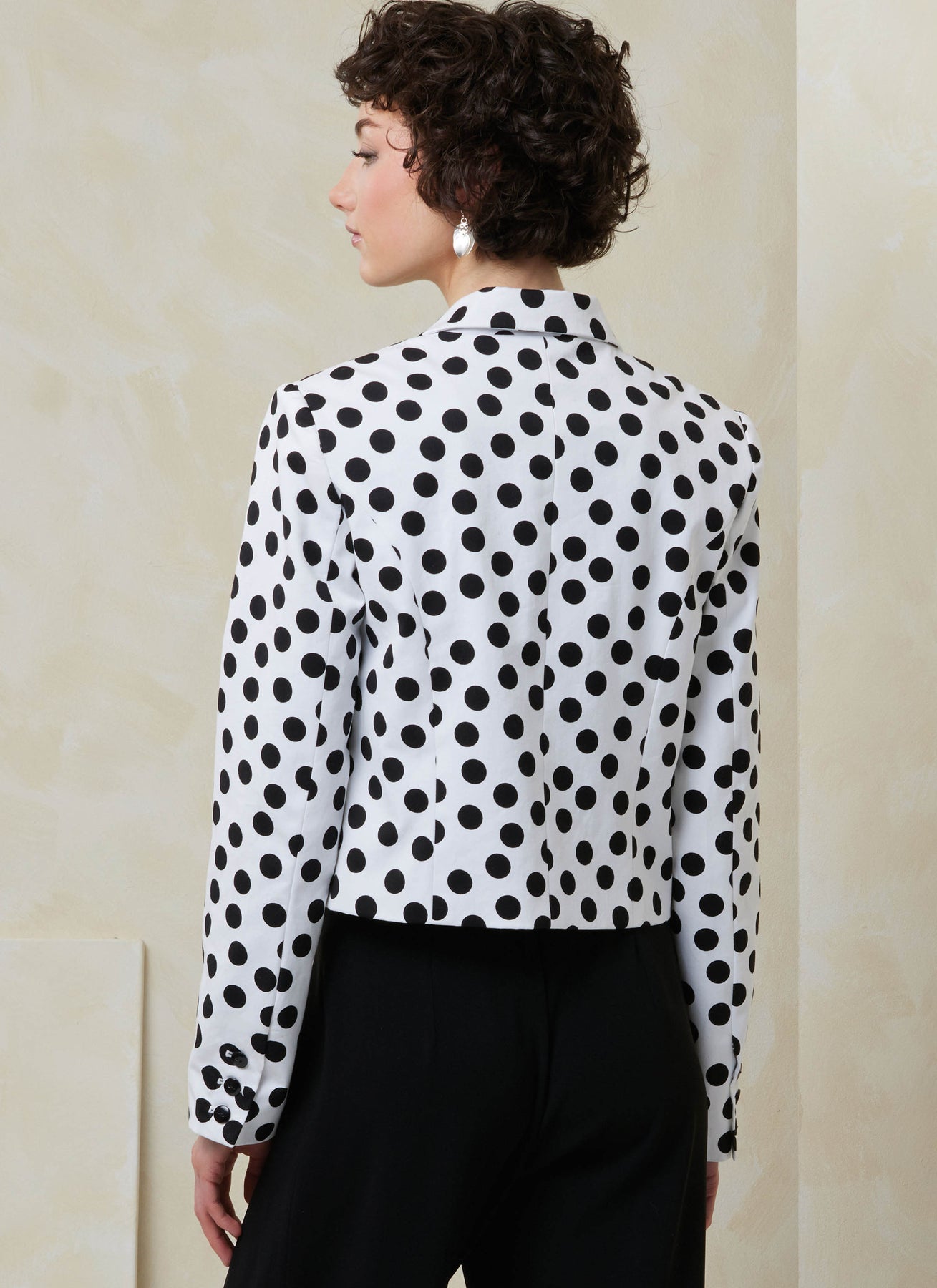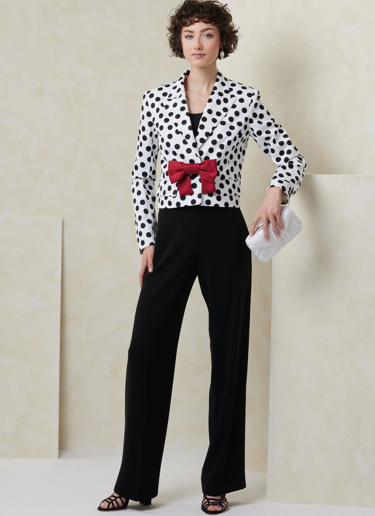 Halb taillierte, gefütterte Kurzjacke mit zweiteiligen Ärmeln und Schlitz, Leistentaschen mit Klappe, Revers und Schulterpolster. Ansicht A hat eine abnehmbare Schleife. Ansicht B hat ein Revers in Kontrastfarbe und verdeckte Knöpfe.