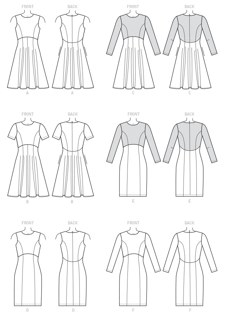 Das Kleid hat ein eng anliegendes Oberteil mit Prinzessnähten, eine geformte Empire-Taille, einen Rundhalsausschnitt und einen unsichtbaren Reißverschluss hinten. A, B, C: Ausgestellter Rock, Taschen, schmaler Saum. D, E, F: Gerader Rock und abgesteppter Saum. C, E: Mieder und Ärmel in Kontrastfarbe. A, D: Ärmellos. B: Kurze Ärmel. C, E, F: Lange Ärmel. Separate Schnittmusterteile für die Körbchengrößen A, B, C, D sind enthalten.